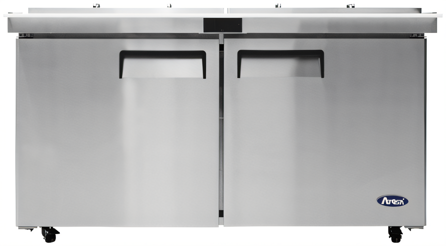 Two-section, 24-pan capacity prep table with 10" cutting boardSpeed up your prep line and keep every ingredient perfectly chilled with Atosa’s 60 inch Mega Top Sandwich/Salad Refrigerator. Built for the busiest delis, cafés and ghost kitchens, the MSF8307GR-NTCV delivers 17.2 cu. ft. of dependable refrigerated storage, a full 24-pan mega top and a generous 10 inch cutting board — all wrapped in heavy-duty stainless steel.
