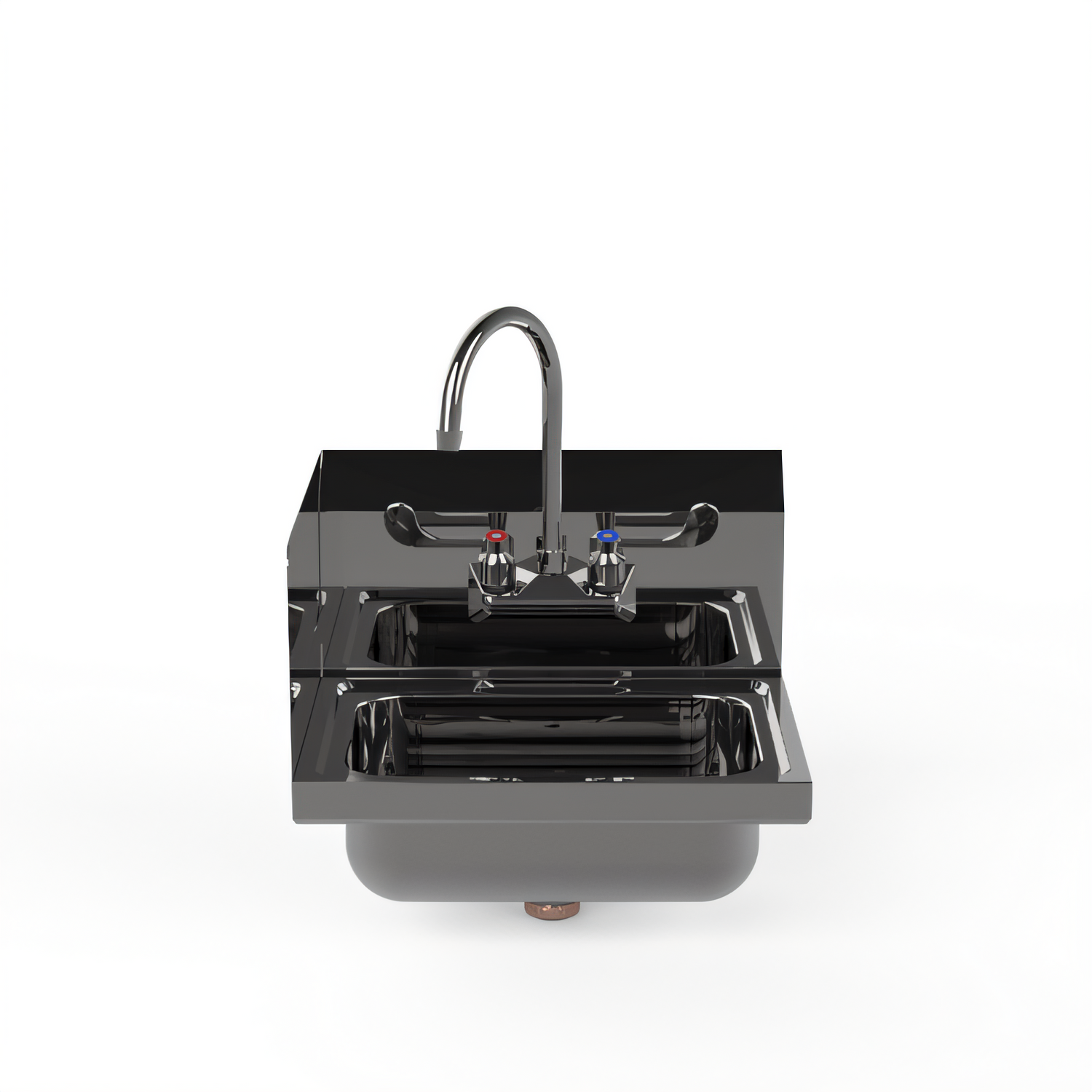 Hand sink, wall-mount, 18 ga 304 stainless steel, 17"W × 15-3/8"D × 13-1/4"H overall, 10"W × 14" front-to-back × 5" deep bowl, 6" backsplash with 2" return & 18 ga left side splash, gooseneck faucet with wrist-blade handles, 1-1/2" waste drain & strainer, Z-clip mounting bracket, NSF