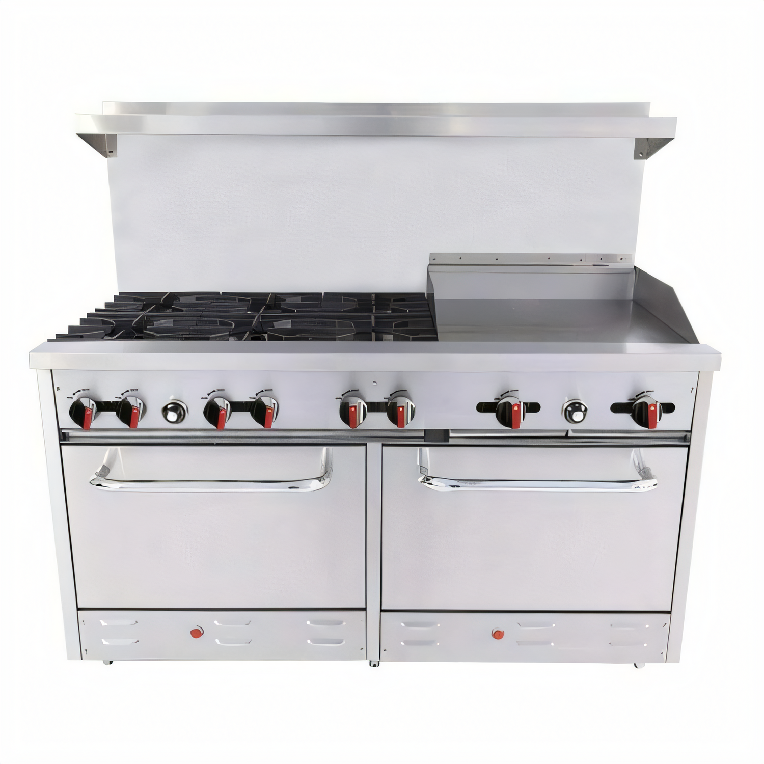 Restaurant Series Range, Natural gas, 60", (6) 30,000 BTU open cast iron burners, 12" x 12" removable cast iron grates, (1) 24" W 3/4" thick griddle with (2) burners, (2) standard ovens, (2) chrome oven rack, 6" plate rail, 2-piece back guard & shelf, stainless steel front & sides, 6" stainless steel legs with adjustable feet, 282,000 BTU, cULus, UL EPH Classified (LP conversion kit included)