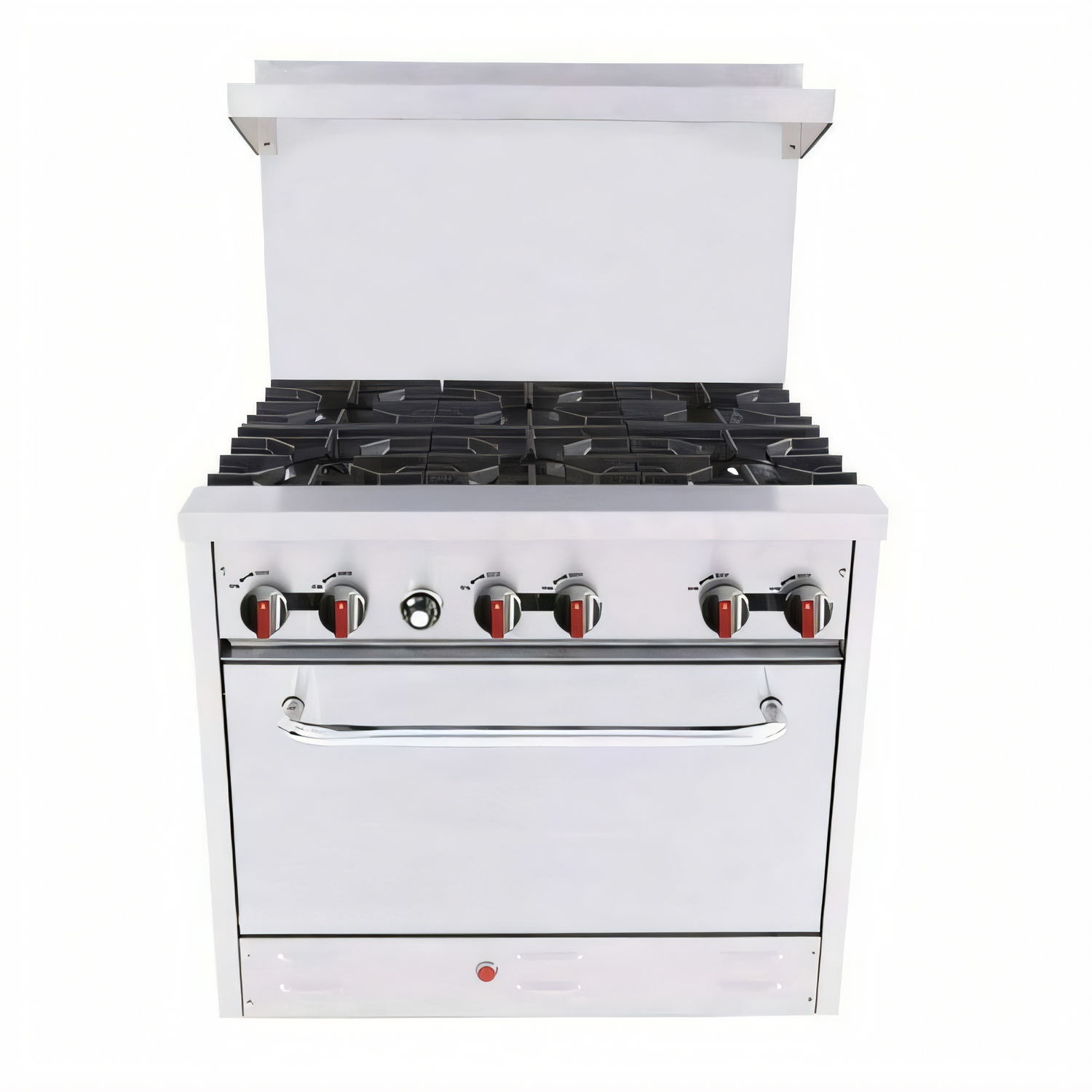 Restaurant Series Range, Natural gas, 36", (6) 30,000 BTU open cast iron burners, 12" x 12" removable cast iron grates, (1) standard oven, (1) chrome oven rack, 6" plate rail, 2-piece back guard & shelf, stainless steel front, sides, 6" stainless steel legs with adjustable feet, 210,000 BTU, cULus, UL EPH Classified (LP conversion kit included)