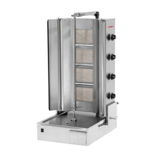 Vertical Broiler, shawarma or gyro, 22.4"W x 28"D x 49.5"H, able to work either natural gas burners or LP gas, (4) independently controlled burners, total of 47,770 BTU (NG) or 52,886 BTU (LPG) of heating power, 180lbs of meat capacity, rocker switch to change direction of spit, sliding bottom housing of the spear, includes shovel and large oil drip container, cULus, UL EPH Classified