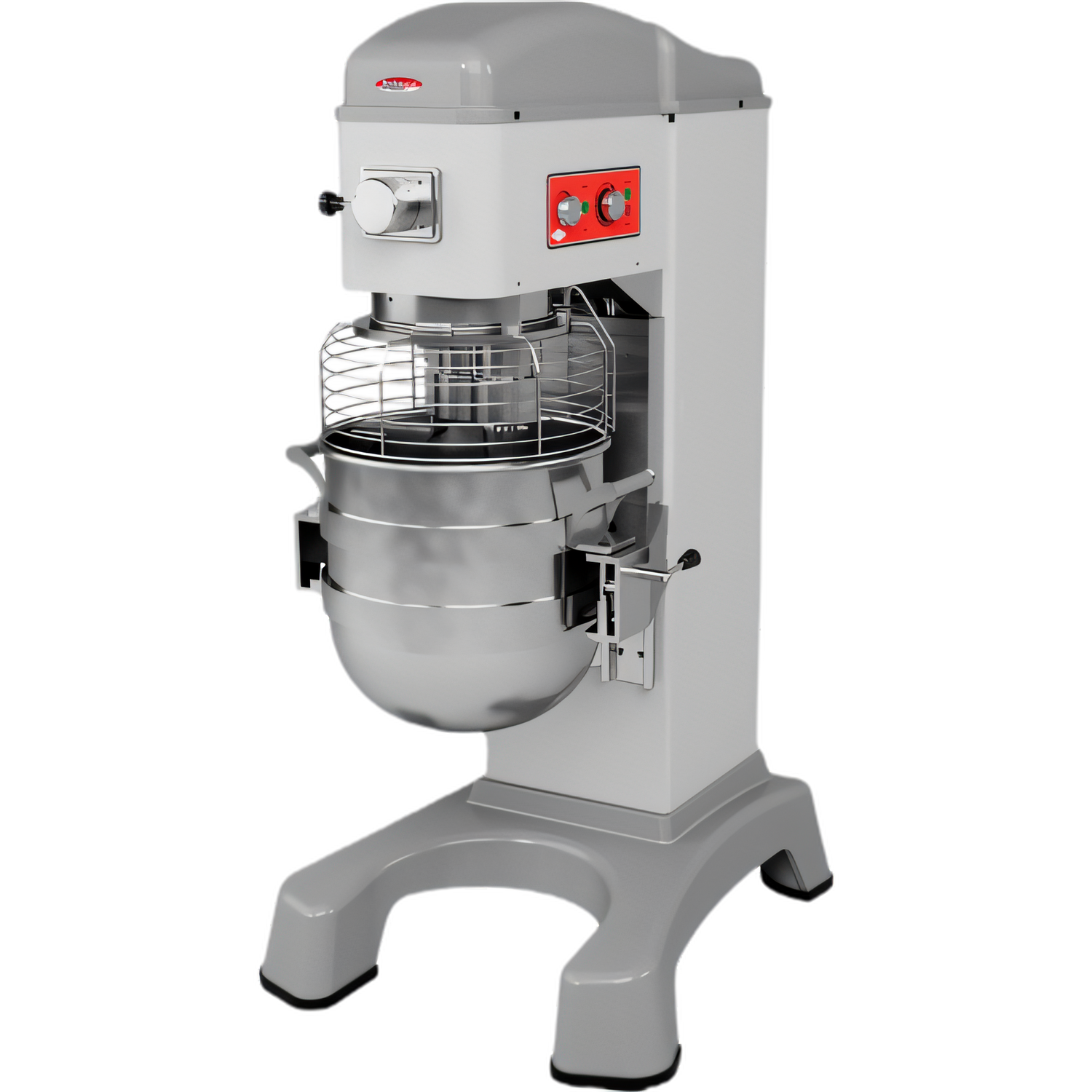 BakeMax 60qt Euro planetary mixer with electric bowl lift, dial speed/timer, safety guard, stainless attachments—powerful, quiet, CE certified.