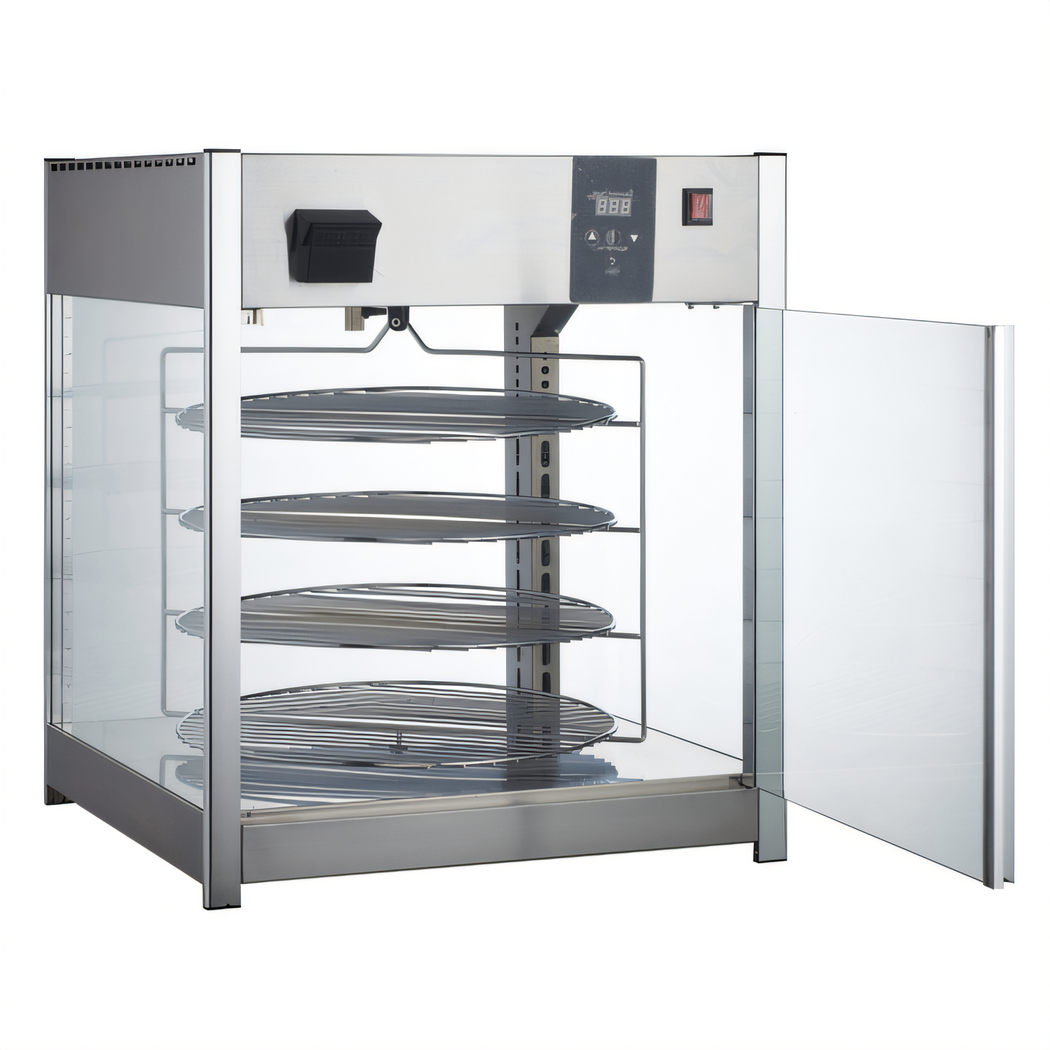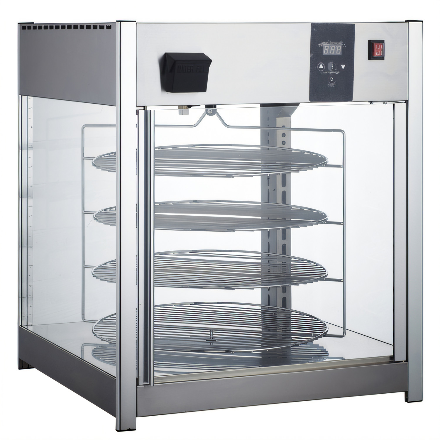 Titan Series Pizza Warmer Display Case, countertop, full service, 25-1/2"W x 23-3/4"D x 27-3/4"H, 86°F - 194°F (30°C - 90°C) temperature range, digital temperature & humidity controls, water reservior, (4) rotating shelves, interior fluorescent lighting, holds 18" dia. pizzas, tempered glass door & side panels, stainless steel construction, 1700 watts, 120v/60/1-ph, 15 amps, NEMA 5-15P, cQPSus, CE, RoHS