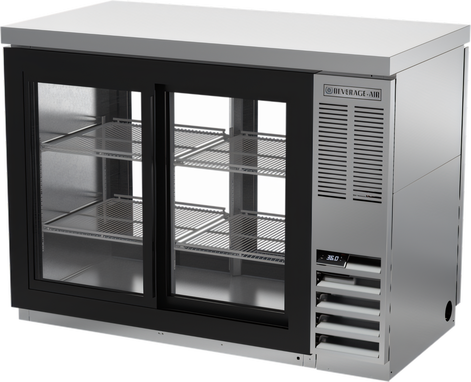 Refrigerated Pass-Thru Food Rated Back Bar Storage Cabinet, two-section, 48"W, 36" H, 13.6 cu. ft. capacity, (4) locking sliding glass doors, (4) epoxy coated steel shelves, (2) 1/2 barrel keg, LED interior lighting with manual on/off switch, 2" stainless steel top, stainless steel exterior with black frame doors, stainless steel interior, meets NSF-Standard 7 for open food container, right-mounted self-contained refrigeration, R290 Hydrocarbon refrigerant, 1/3 HP, cULus, UL EPH Classified, UL-Sanitation