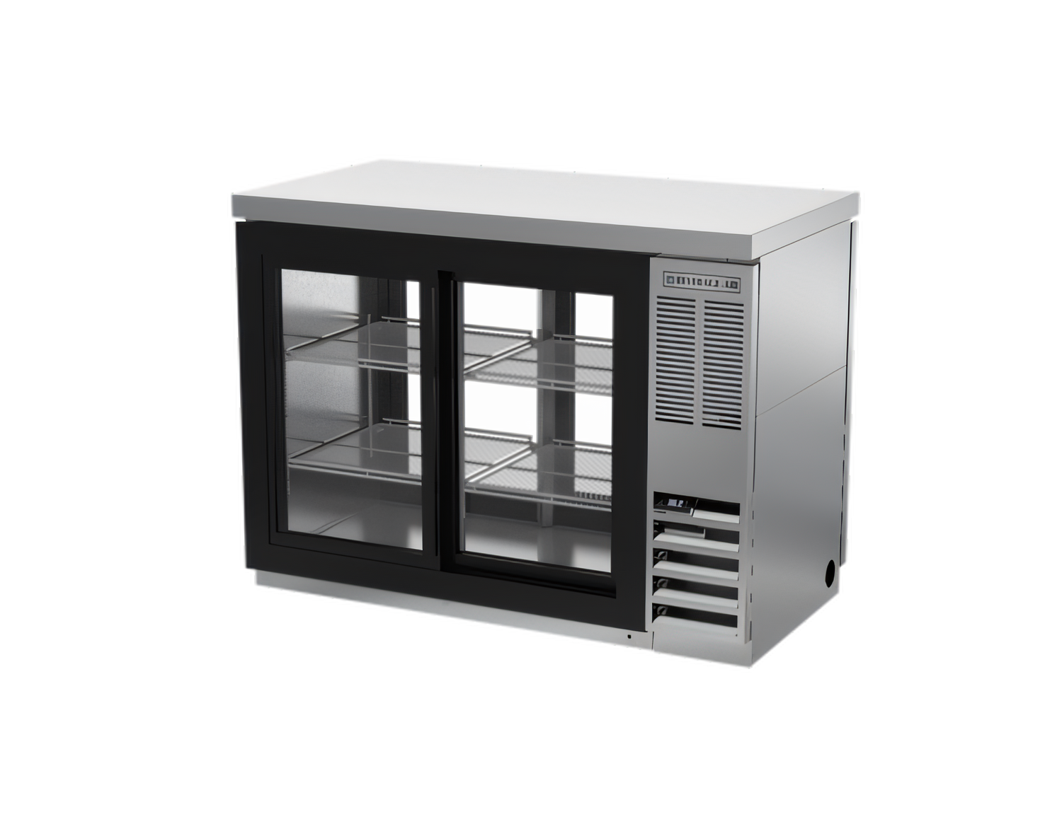 Refrigerated Pass-Thru Back Bar Refrigerator, two-section, 48"W, 36" H, 13.6 cu. ft. capacity, (4) locking sliding glass doors, (4) epoxy coated steel shelves, (2) 1/2 barrel keg, LED interior lighting, 2" stainless steel top, stainless steel exterior with black frame doors, galvanized steel interior with stainless steel floor, right-mounted self-contained refrigeration, R290 Hydrocarbon refrigerant, 1/3 HP, cULus, UL EPH Classified, UL-Sanitation
