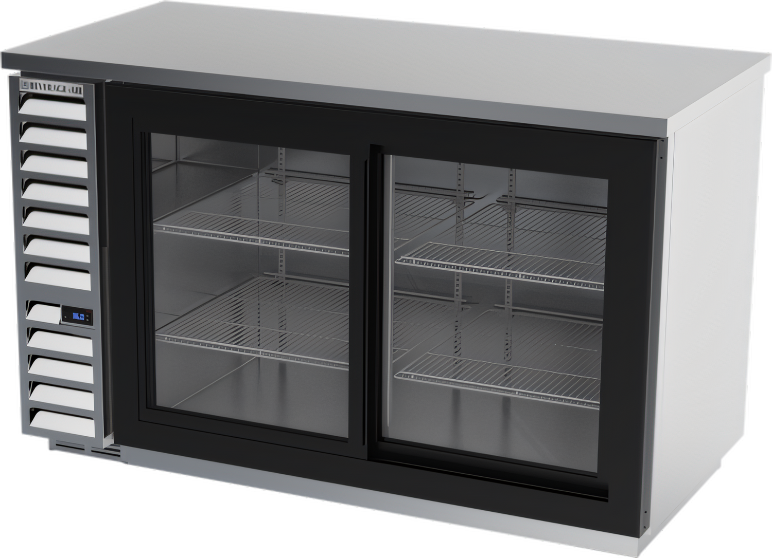 Refrigerated Back Bar Storage Cabinet, two-section, 59"W, 37-1/4" H, 21.86 cu. ft., (2) locking sliding glass doors, snap-in door gasket, (4) epoxy coated steel shelves, (2) 1/2 barrel kegs, LED interior lighting with manual on/off switch, stainless steel top,stainless steel front with black door frames, gray painted sides, galvanized interior, left-mounted self-contained refrigeration, R290 Hydrocarbon refrigerant, 1/4 HP, cULus, UL EPH Classified, UL-Sanitation