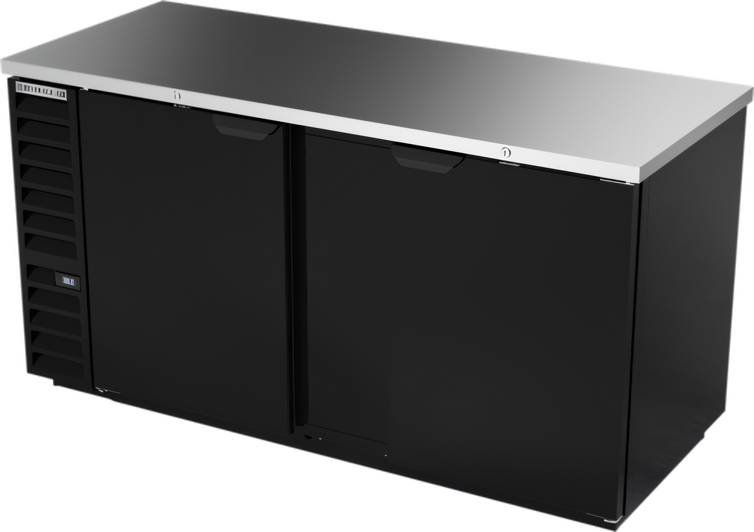 Beverage Air BB68HC-B Back Bar Cooler — 68" two-section refrigerated storage cabinet ideal for bars and restaurants. Features a durable stainless steel top, black exterior, galvanized interior, (2) solid doors with snap-in gaskets, four epoxy-coated shelves, LED interior lighting, and capacity for up to three 1/2-barrel kegs. Energy-efficient R290 refrigeration, 1/3 HP self-contained system, 115V, UL/cULus listed for reliable commercial performance.