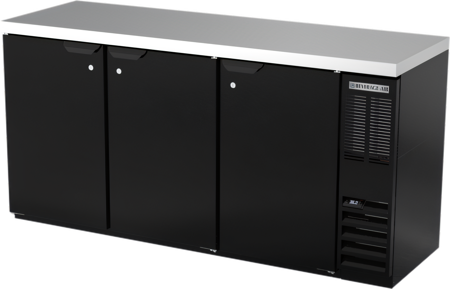 Refrigerated Back Bar Storage Cabinet, three-section, 72"W, 36" H, 19.92 cu. ft. capacity, (3) solid doors with locks, snap-in door gasket, (6) epoxy coated steel shelves, (3) 1/2 barrel kegs, LED interior lighting with manual on/off switch, 2" stainless steel top, black exterior finish, galvanized interior with stainless steel floor, right-mounted self-contained refrigeration, R290 Hydrocarbon refrigerant, 1/3 HP, cULus, UL EPH Classified, UL-Sanitation