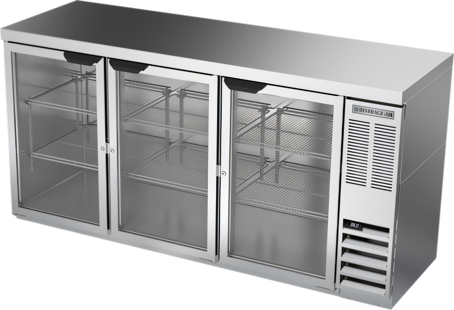 Refrigerated Food Rated Back Bar Storage Cabinet, three-section, 72"W, 36" H, 19.92 cu. ft. capacity, (3) glass doors with locks, snap-in door gasket, (6) epoxy coated steel shelves, (3) 1/2 barrel kegs, LED interior lighting with manual on/off switch, stainless steel exterior, 2" stainless steel top, stainless steel interior, meets NSF-Standard 7 for open food container, right-mounted self-contained refrigeration, R290 Hydrocarbon refrigerant, 1/3 HP, cULus, UL EPH Classified, UL-Sanitation