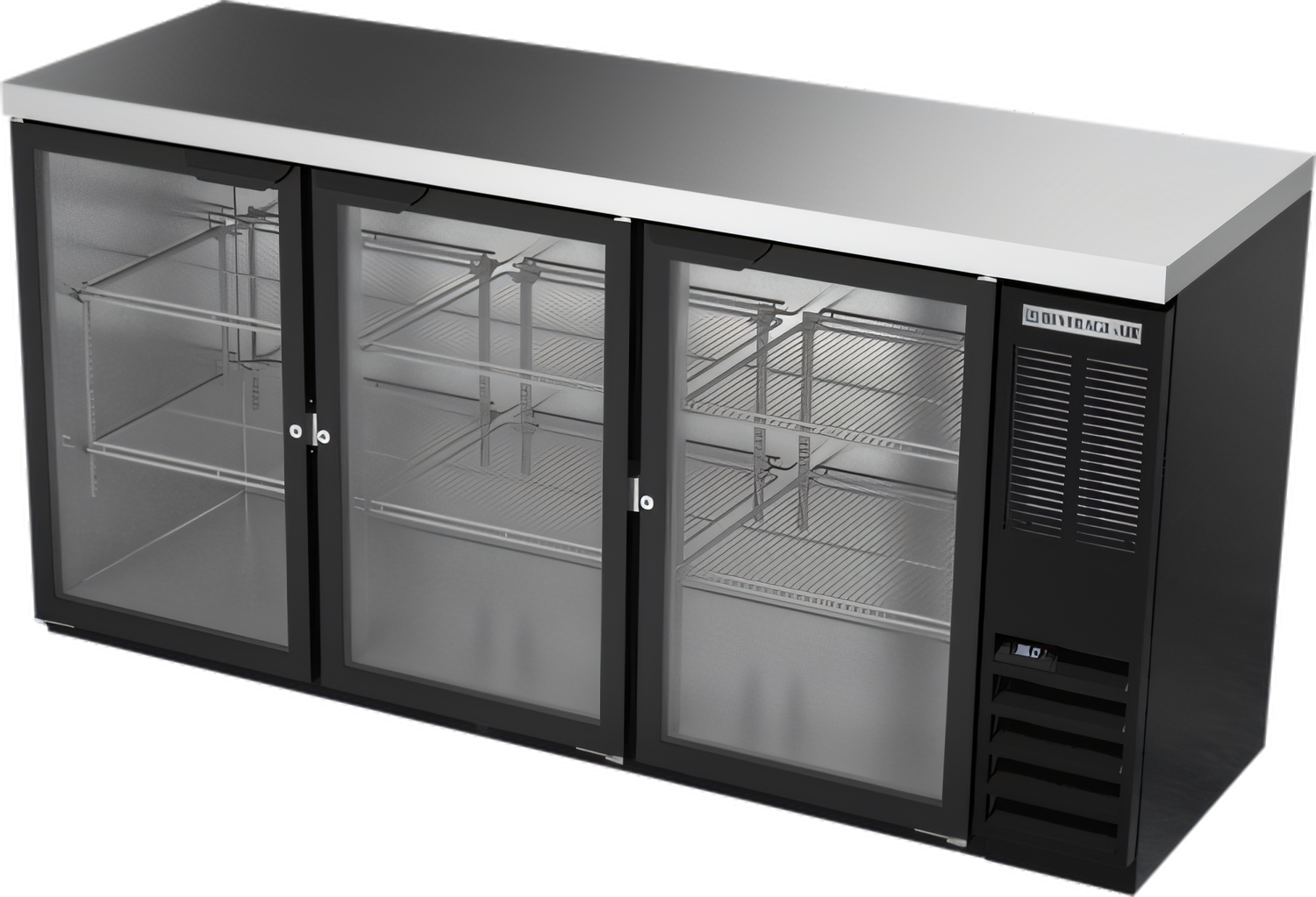 Refrigerated Back Bar Storage Cabinet, three-section, 72"W, 36" H, 19.92 cu. ft. capacity, (3) glass doors with locks, snap-in door gasket, (6) epoxy coated steel shelves, (3) 1/2 barrel kegs, LED interior lighting with manual on/off switch, 2" stainless steel top, black exterior finish, galvanized interior with stainless steel floor, right-mounted self-contained refrigeration, R290 Hydrocarbon refrigerant, 1/3 HP, cULus, UL EPH Classified, UL-Sanitation