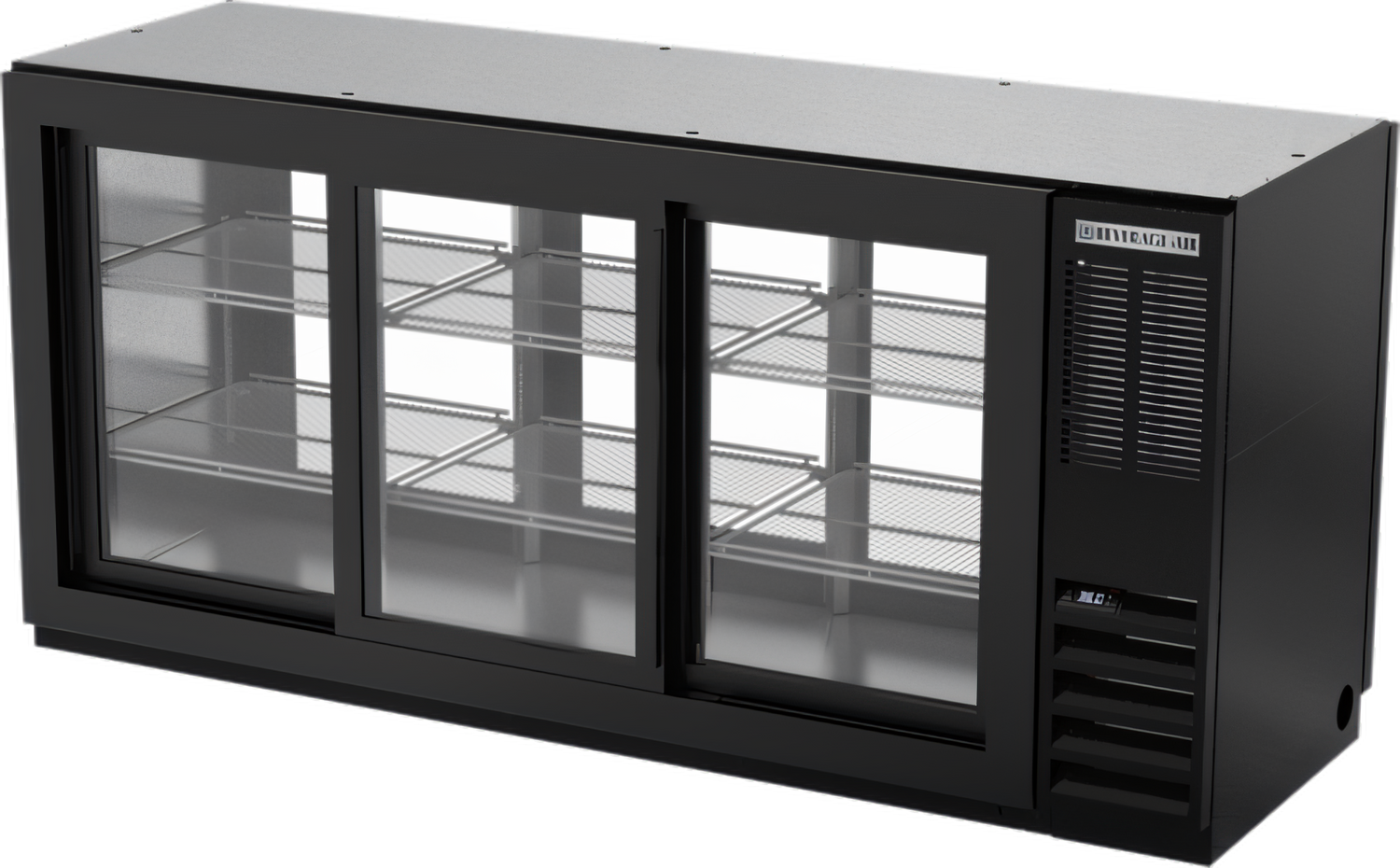 Refrigerated Open Food Rated Back Bar Pass-Thru Storage Cabinet, three-section, 72"W, 34" H, 22.1 cu. ft. capacity, (6) locking sliding glass doors, (6) epoxy coated steel shelves, (3) 1/2 barrel kegs, LED interior lighting with manual on/off switch, black exterior finish, galvanized top, stainless steel interior with radius corners is easy to keep clean & meets NSF Standard 7 for open food container, right-mounted self-contained refrigeration, R290 Hydrocarbon refrigerant, 1/3 HP, cULus, UL EPH Classified, UL-Sanitation
