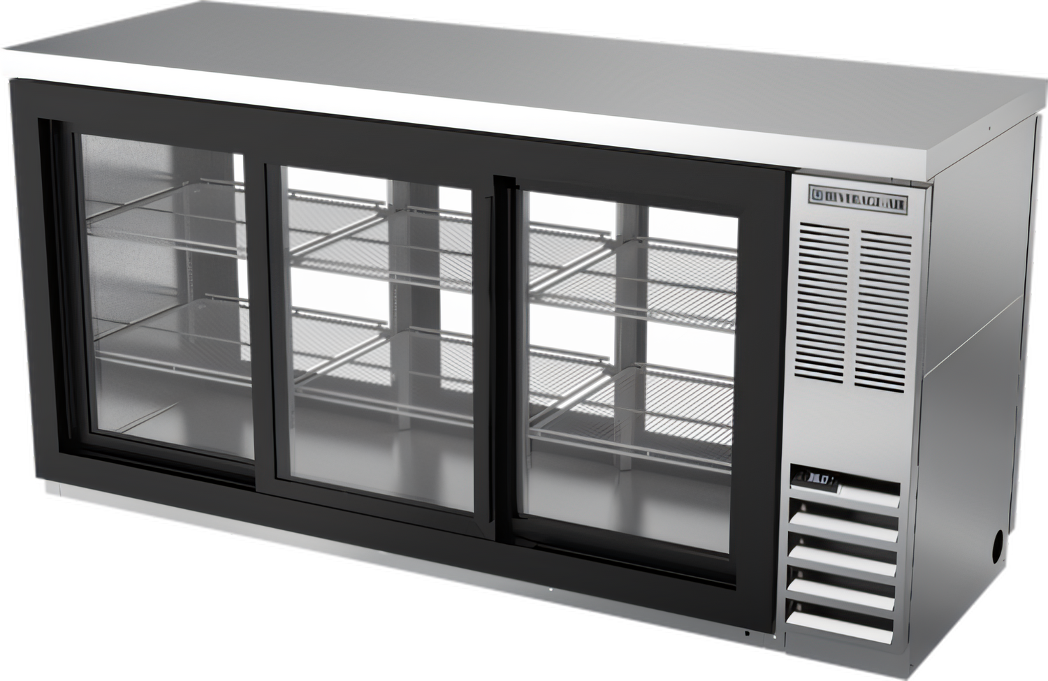 Refrigerated Open Food Rated Back Bar Pass-Thru Storage Cabinet, three-section, 72"W, 36" H, 22.1 cu. ft. capacity, (6) locking sliding glass doors, (6) epoxy coated steel shelves, (3) 1/2 barrel kegs, LED interior lighting with manual on/off switch, stainless steel exterior construction, 2" stainless steel top, stainless steel interior with radius corners is easy to keep clean & meets NSF Standard 7 for open food container, right-mounted self-contained refrigeration, R290 Hydrocarbon refrigerant, 1/3 HP, cULus, UL EPH Classified, UL-Sanitation