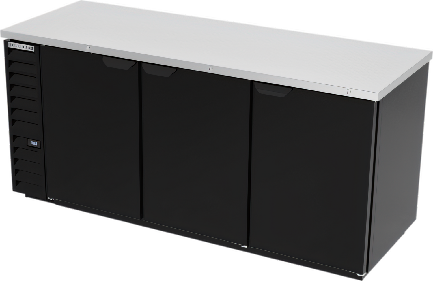 Refrigerated Food Rated Back Bar Storage Cabinet, three-section, 79"W, 37-1/4" H, 33.59 cu. ft., (3) solid doors, snap-in door gasket, (6) epoxy coated steel shelves, (4) 1/2 barrel kegs, LED interior lighting with manual on/off switch, black exterior finish, 2" stainless steel top, stainless steel interior with radius corners is easy to keep clean & meets NSF Standard 7 for open container, left-mounted self-contained refrigeration with storage above, R290 Hydrocarbon refrigerant, 1/3 HP, cULus, UL EPH Classified, UL-Sanitation