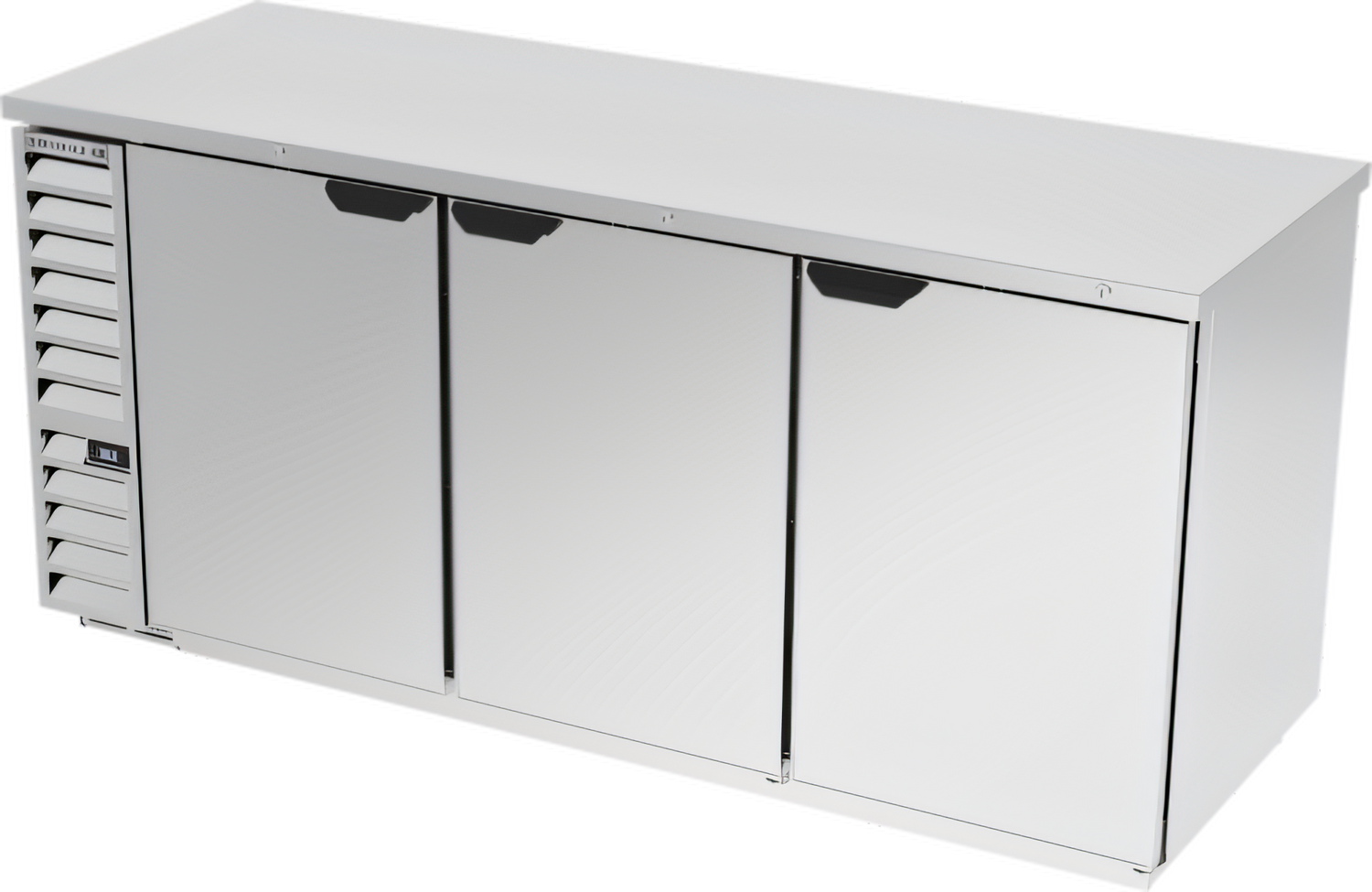 Refrigerated Food Rated Back Bar Storage Cabinet, three-section, 79"W, 37-1/4" H, 33.59 cu. ft., (3) solid doors, snap-in door gasket, (6) epoxy coated steel shelves, (4) 1/2 barrel kegs, LED interior lighting with manual on/off switch, stainless steel top, stainless steel interior with radius corners is easy to keep clean & meets NSF Standard 7 for open container, left-mounted self-contained refrigeration with storage above, R290 Hydrocarbon refrigerant, 1/3 HP, cULus, UL EPH Classified, UL-Sanitation
