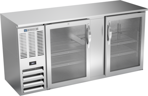 Beverage Air 68" back bar cooler: stainless steel, glass doors, LED lighting, 18.2 cu ft, holds kegs, energy-efficient R290 refrigeration.