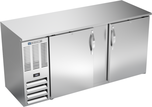 Beverage Air 68" back bar cooler — stainless top, 18.2 cu ft, LED light, 2 solid doors, 4 shelves, efficient R290 refrigeration.