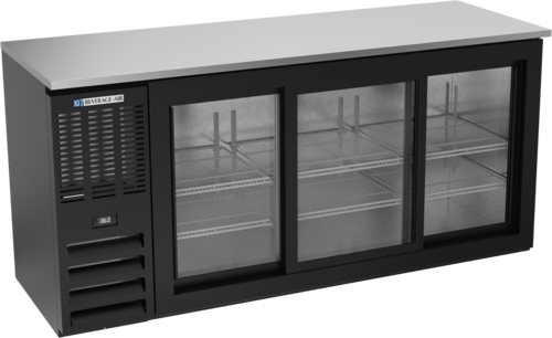 Refrigerated Back Bar Storage Cabinet, three-section, 72"W x 25-1/4"D x 34"H, 19.618 cu. ft. capacity, (3) locking sliding glass doors, snap-in door gasket, (6) epoxy coated steel shelves, (3) 1/2 barrel kegs, LED interior lighting with manual on/off switch, black exterior finish, 1" stainless steel top, galvanized steel interior with stainless steel floor, right-mounted self-contained refrigeration, R290 Hydrocarbon refrigerant, 1/3 HP, 3.3 amps, 115v/60/1-ph, NEMA 5-15P, cULus, UL EPH Classified