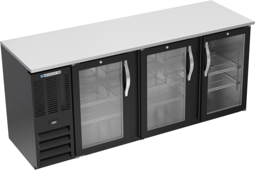 Refrigerated Back Bar Storage Cabinet, three-section, 78"W x 26-3/8"D x 34"H, 21.686 cu. ft., (3) glass doors, snap-in door gasket, (6) epoxy coated steel shelves, (4) 1/2 barrel kegs, LED interior lighting with manual on/off switch, 1" stainless steel top, black exterior finish, galvanized interior, left-mounted self-contained refrigeration, R290 Hydrocarbon refrigerant, 1/3 HP, 3.3 amps, 115v/60/1-ph, NEMA 5-15P, cULus, UL EPH Classified