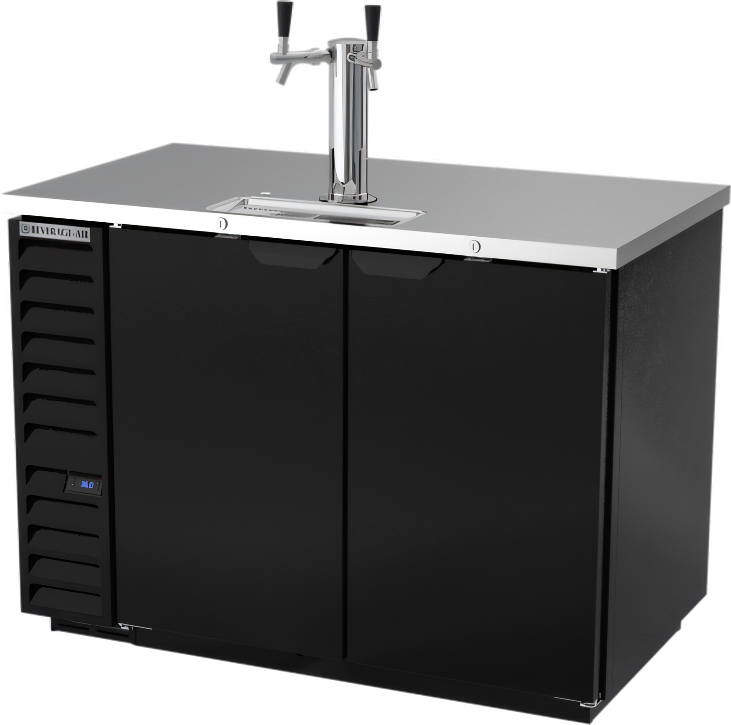 Draft Beer Cooler, 50-1/2"W, 29"D, 17.86 cu. ft., (2) doors, (2) keg capacity, door locks, (1) dual faucet column, black exterior, stainless steel top, galvanized interior with reinforced stainless steel floor, self-contained refrigeration, R290 Hydrocarbon refrigerant, 1/4 HP, cULus, UL EPH Classified, UL-Sanitation