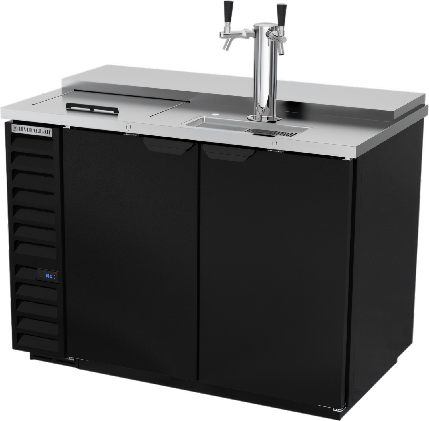 Draft Beer Cooler, Club Top, 50-1/2"W, 29"D, 17.86 cu. ft., (2) doors, (1) slide back lid with (1) shelf, (2) keg capacity, door locks, (1) dual faucet tower, black exterior, stainless steel top, galvanized interior with reinforced stainless steel floor, self-contained refrigeration, R290 Hydrocarbon refrigerant, 1/4 HP, cULus, UL EPH Classified, UL-Sanitation