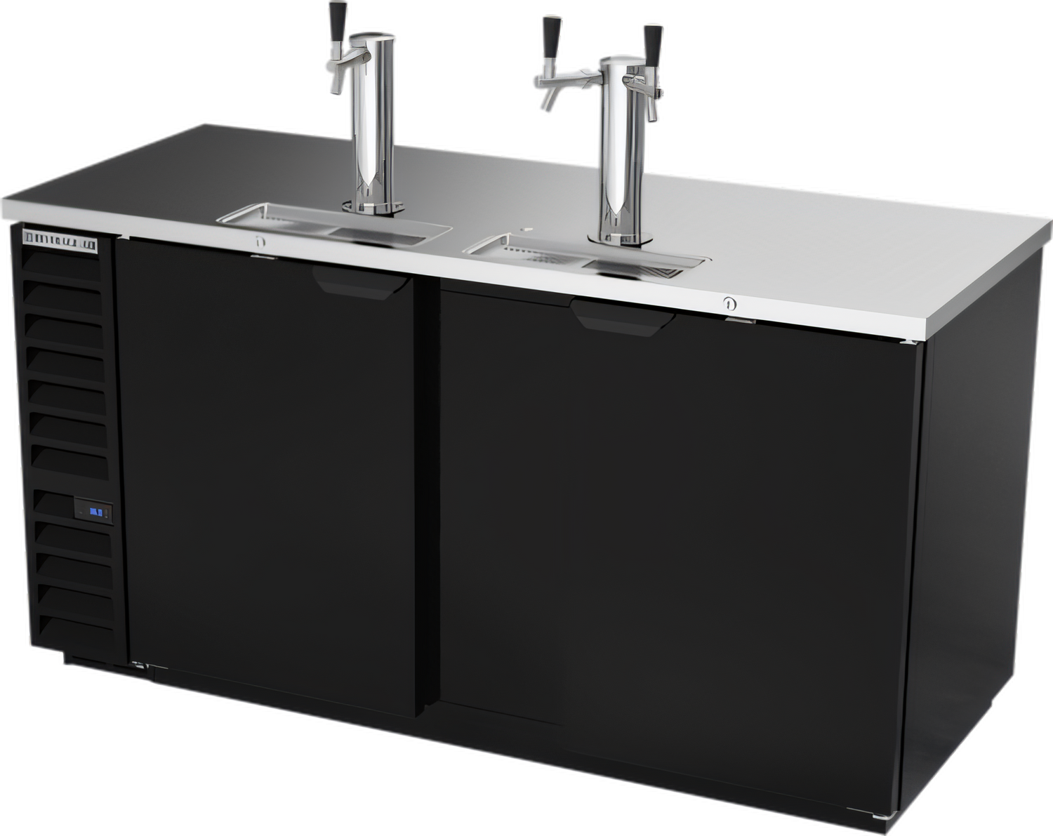 Draft Beer Cooler, 69"W, 29"D, 25.93 cu. ft., (2) doors, (3) keg capacity, door locks, (1) single & (1) dual faucet towers, black exterior, stainless steel top, galvanized interior with reinforced stainless steel floor, self-contained refrigeration, R290 Hydrocarbon refrigerant, 1/3 HP, cULus, UL EPH Classified, UL-Sanitation
