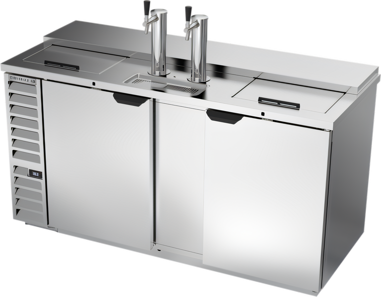 Draft Beer Cooler, Club Top, 69"W, 28-3/16"D, 25.93 cu. ft., (2) doors, (2) slide back lids - (1) with shelf & (1) with basket, (3) keg capacity, door locks, (2) single faucet columns, stainless steel top & front, galvanized interior with reinforced stainless steel floor, column type beer faucets, self-contained refrigeration, R290 Hydrocarbon refrigerant, 1/3 HP, cULus, UL EPH Classified, UL-Sanitation