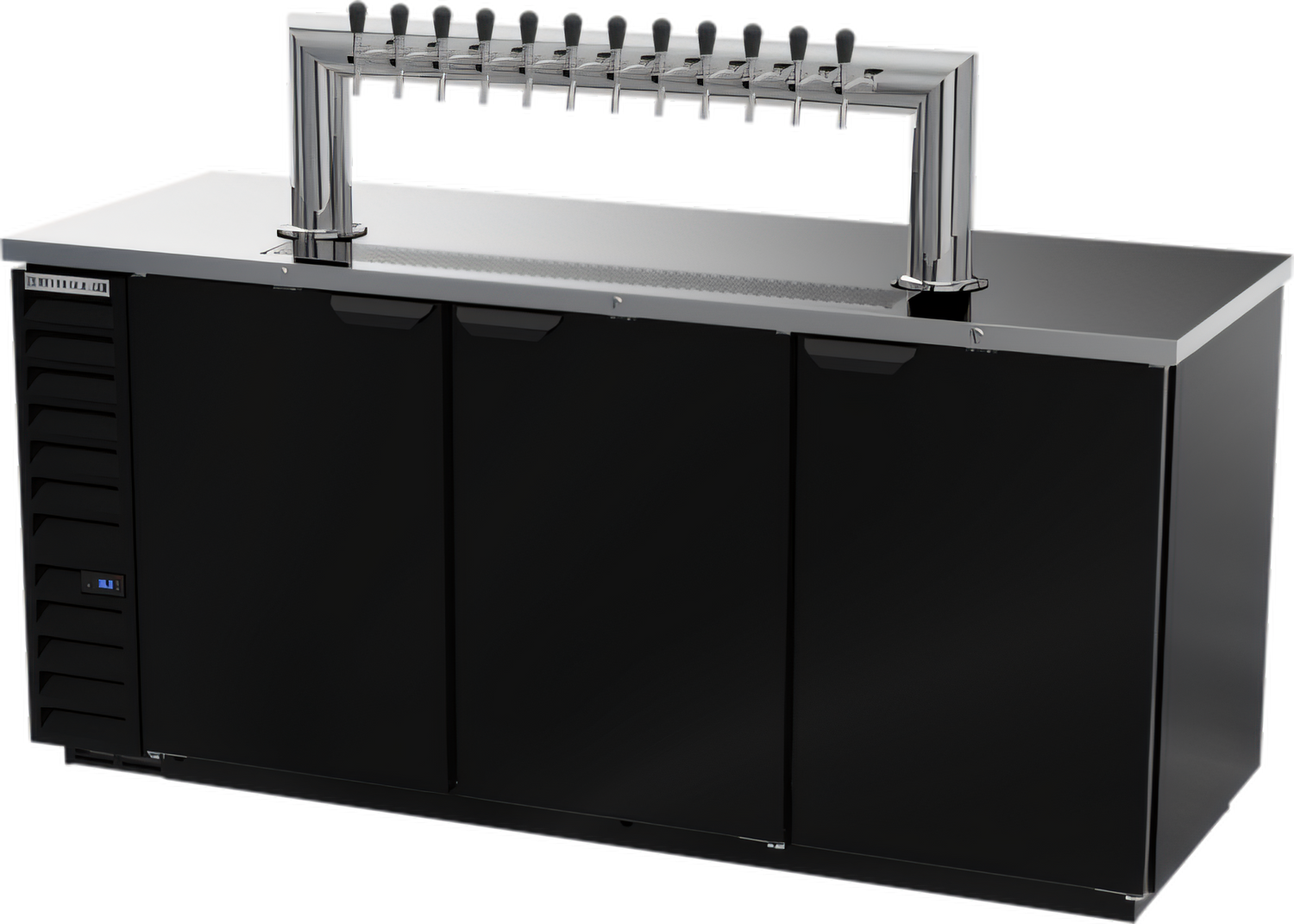 Draft Beer Cooler, 79"W, 28-3/16"D, 33.59 cu. ft., (3) doors, (4) keg capacity, door locks, (12) tap tower, black exterior, stainless steel top, galvanized interior with reinforced stainless steel floor, self-contained refrigeration, R290 Hydrocarbon refrigerant, 1/3 HP, cULus, UL EPH Classified, UL-Sanitation