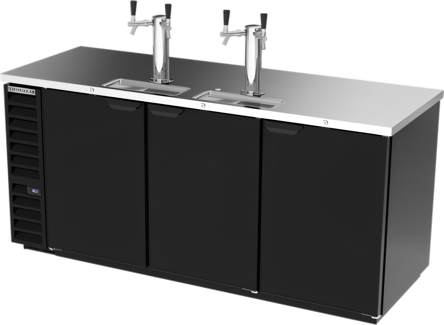 Draft Beer Cooler, 79"W, 29"D, 33.59 cu. ft., (3) doors, (4) keg capacity, door locks, (2) dual faucet towers, black exterior, stainless steel top, galvanized interior with reinforced stainless steel floor, self-contained refrigeration, R290 Hydrocarbon refrigerant, 1/3 HP, cULus, UL EPH Classified, UL-Sanitation