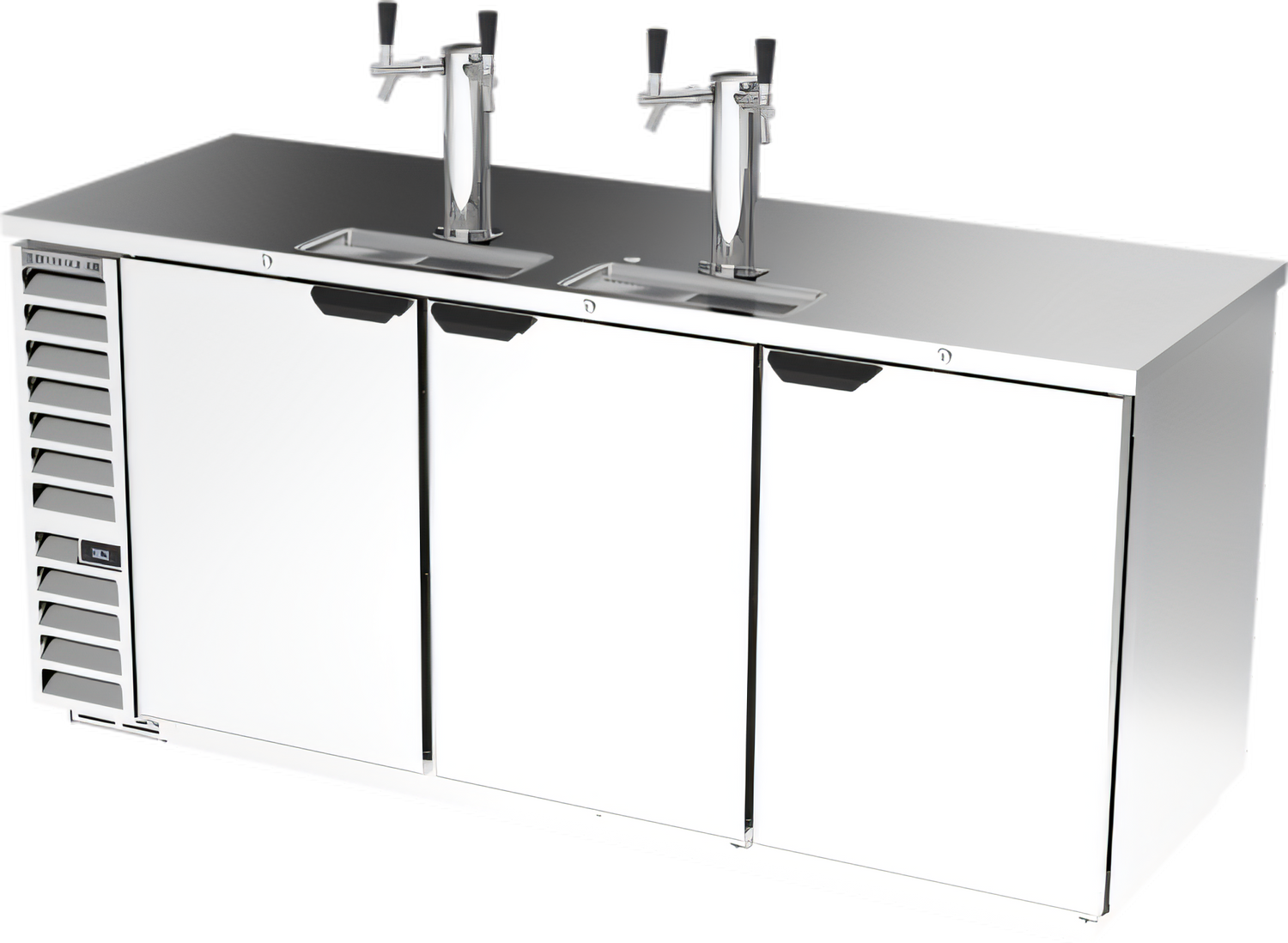 Draft Beer Cooler, 79"W, 29"D, 33.59 cu. ft., (3) doors, (4) keg capacity, door locks, (2) dual faucet towers, stainless steel top & front, galvanized interior with reinforced stainless steel floor, self-contained refrigeration, R290 Hydrocarbon refrigerant, 1/3 HP, cULus, UL EPH Classified, UL-Sanitation