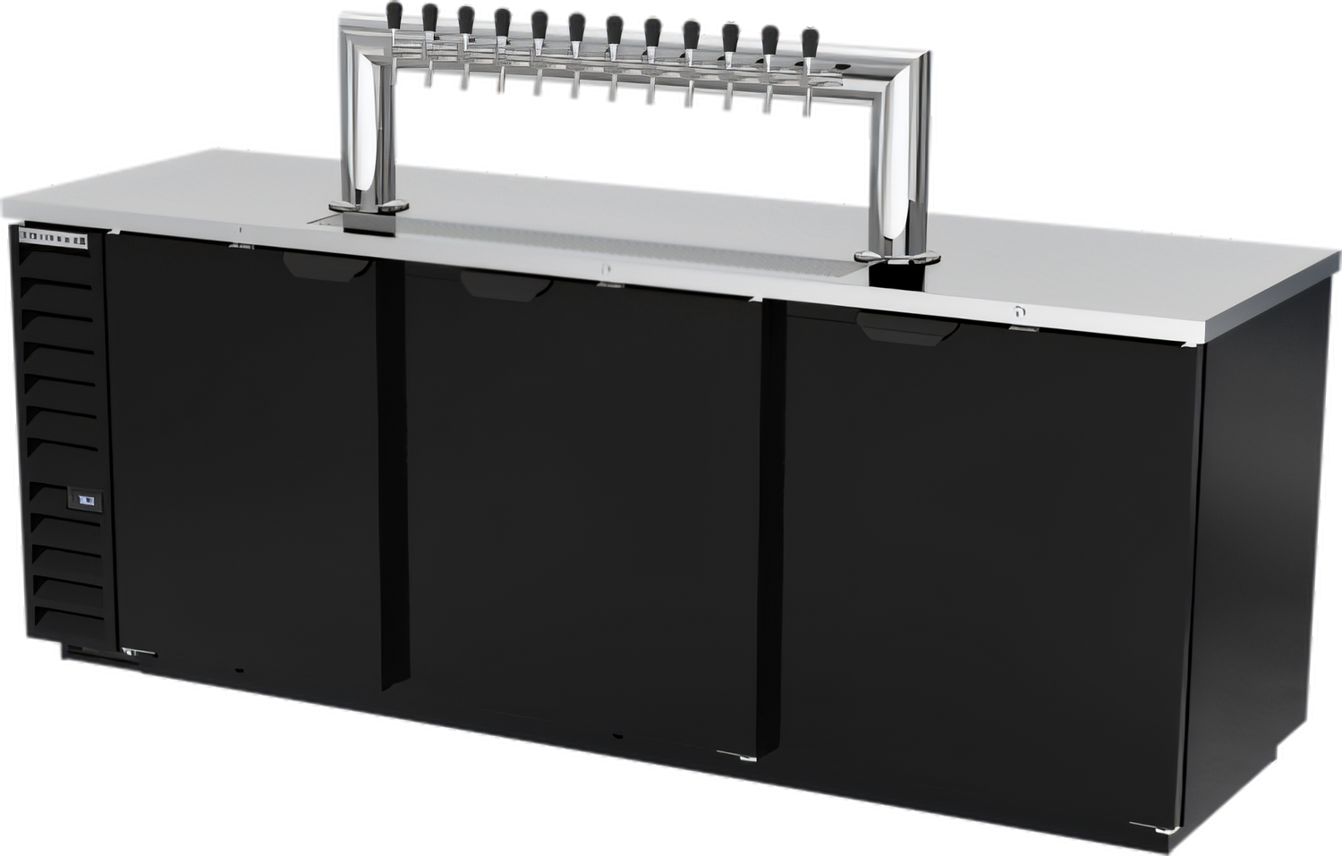 Draft Beer Cooler, 95"W, 29"D, 37.82 cu. ft., (3) doors, (5) keg capacity, door locks, (12) tap tower, black exterior, stainless steel top, galvanized interior with reinforced stainless steel floor, self-contained refrigeration, R290 Hydrocarbon refrigerant, 1/3 HP, cULus, UL EPH Classified, UL-Sanitation
