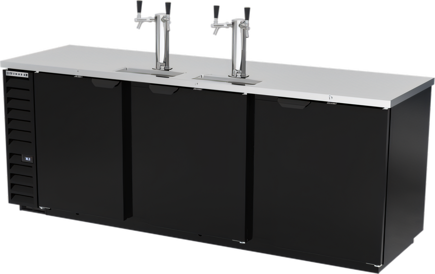 Draft Beer Cooler, 95"W, 29"D, 37.82 cu. ft., (3) doors, (5) keg capacity, door locks, (2) dual faucet columns, black exterior, stainless steel top, galvanized interior with reinforced stainless steel floor, self-contained refrigeration, R290 Hydrocarbon refrigerant, 1/3 HP, cULus, UL EPH Classified, UL-Sanitation