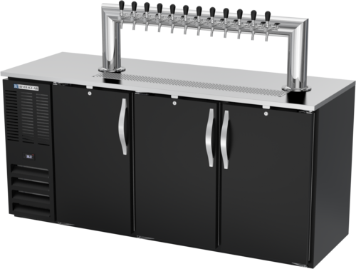 Direct Draw Dispenser, 72"W x 26-3/8"D x 49-7/8"H, 23.643 cu. ft., (3) doors, (3) 1/2 keg capacity, door locks, (12) tap tower, black exterior, stainless steel top & drip tray, galvanized interior with reinforced stainless steel floor walls & ceiling with stainless steel floor, self-contained refrigeration, R290 Hydrocarbon refrigerant, 1/3 HP, 3.3 amps, NEMA 5-15P, 115v/60/1-ph, cULus, UL EPH Classified