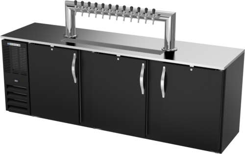 Beverage Air 94" direct-draw back bar cooler: 12-tap, 3-door, 27.2 cu ft, stainless top, R290 efficient refrigeration, lockable doors.