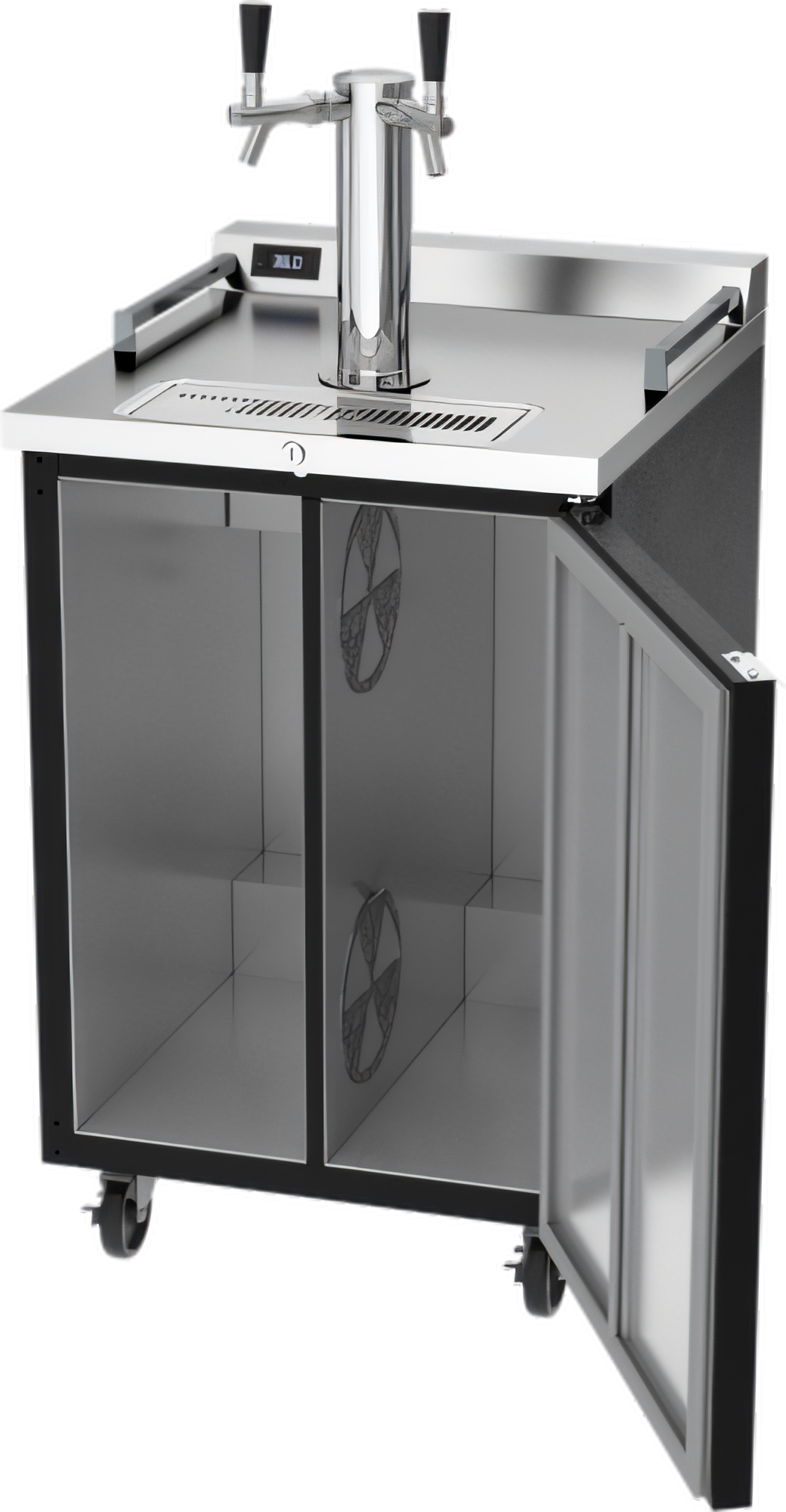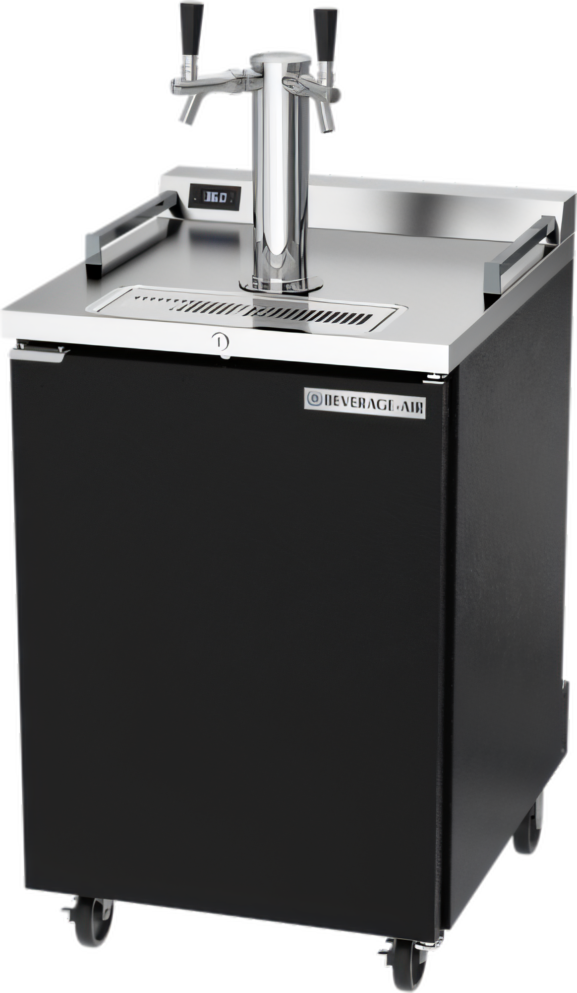 Dual Zone Wine & Beer Draft Cooler, 24"W, 30-3/4"D, 7.44 cu. ft., (1) solid hinged door, holds (4) 1/6 size kegs (2 per section), door locks, (1) 2 tap tower, dual temperature zone: left side maintains 32°-40°F & right side maintains 50°-65°F (unit has a minimum variance of +/-15°F & maximum of 20°F depending on condition), black exterior, electronic control, drip tray, stainless steel top, galvanized interior, stainless steel floor, self-contained refrigeration, 1/6 HP, 4" casters (2 with brakes), cULus, UL EPH Classified, UL-Sanitation