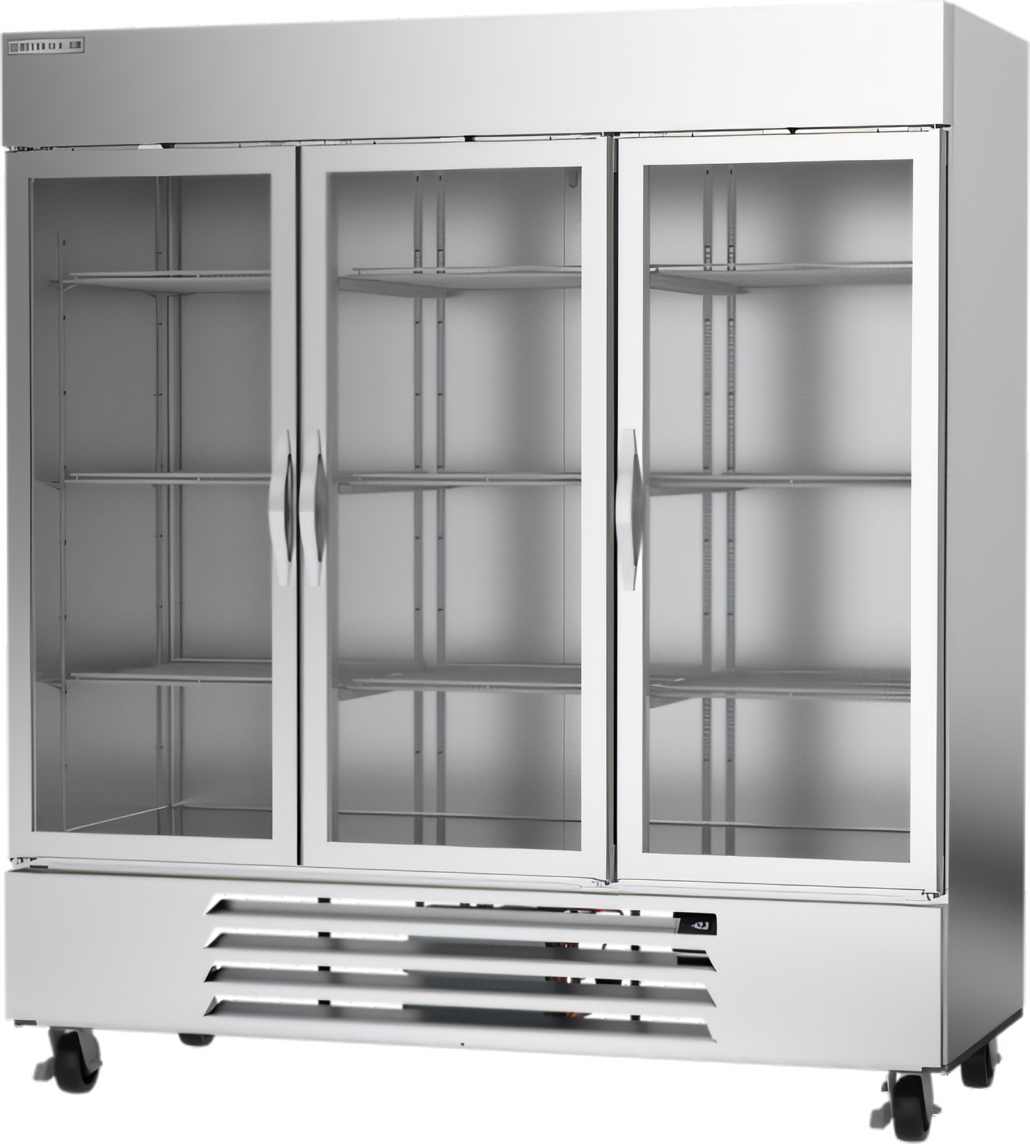 Horizon Series Freezer, reach-in, three-section, 75"W, 84-1/8"H, 68.43 cu. ft. capacity, (1) center glass door right-hand hinged, (1) right glass door right-hand hinged, (1) left glass door left-hand hinged, (9) adjustable shelves, electronic control, LED interior lighting, digital display, adaptive defrost, bottom mounted self-contained refrigeration, stainless steel interior, exterior stainless steel front, sides & grille (galvanized back & bottom), R290 Hydrocarbon refrigerant, (2) 3/4 HP, cULus, UL EPH Classified, UL-Sanitation