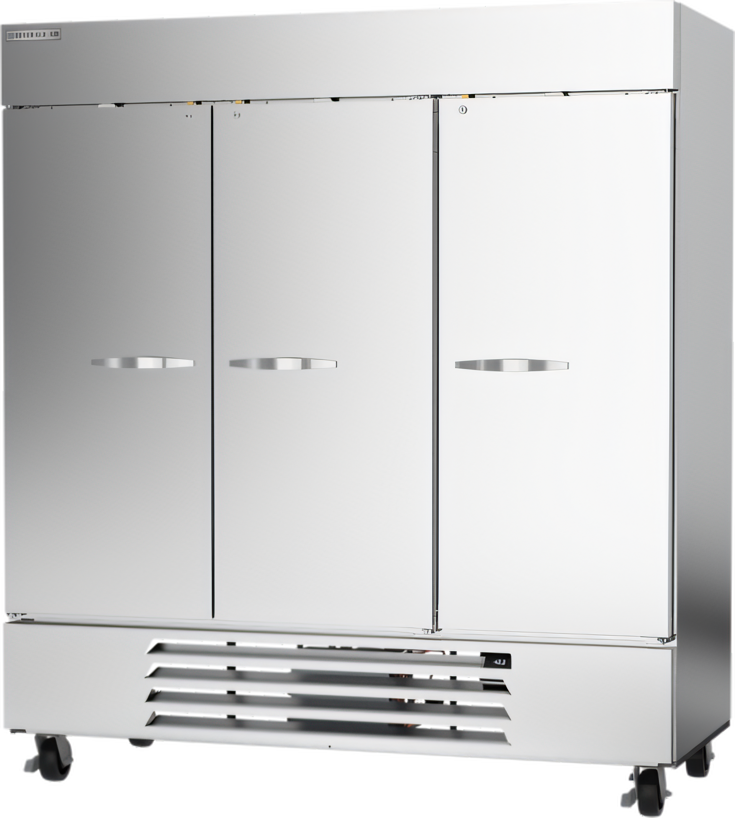 Horizon Series Freezer, reach-in, three-section, 75"W, 84-1/8"H, 68.43 cu. ft. capacity, (1) center solid door right-hand hinged, (1) right solid door right-hand hinged, (1) left solid door left-hand hinged, door locks, (9) adjustable shelves, electronic control, LED interior lighting, digital display, adaptive defrost, bottom mounted self-contained refrigeration, stainless steel interior, exterior stainless steel front, sides & grille (galvanized back & bottom), R290 Hydrocarbon refrigerant, (2) 3/4 HP, cULus, UL EPH Classified, UL-Sanitation