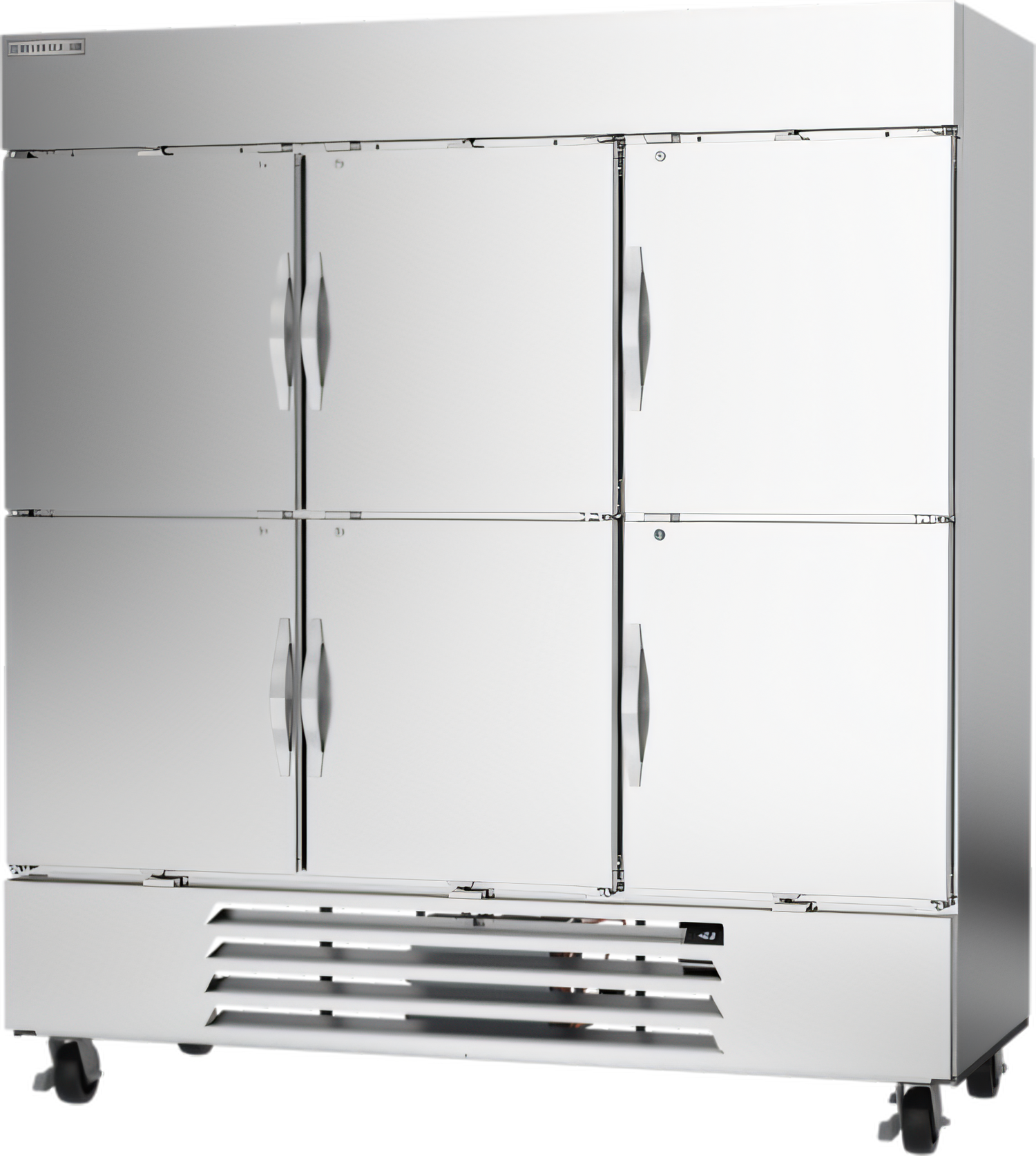 Horizon Series Freezer, reach-in, three-section, 75"W, 84-1/8"H, 68.43 cu. ft. capacity, (2) center solid half doors right-hand hinged, (2) right solid half doors right-hand hinged, (2) left solid half doors left-hand hinged, door locks, (9) adjustable shelves, electronic control, LED interior lighting, digital display, adaptive defrost, bottom mounted self-contained refrigeration, stainless steel interior, exterior stainless steel front, sides & grille (galvanized back & bottom), R290 Hydrocarbon refrigerant, (2) 3/4 HP, cULus, UL EPH Classified, UL-Sanitation