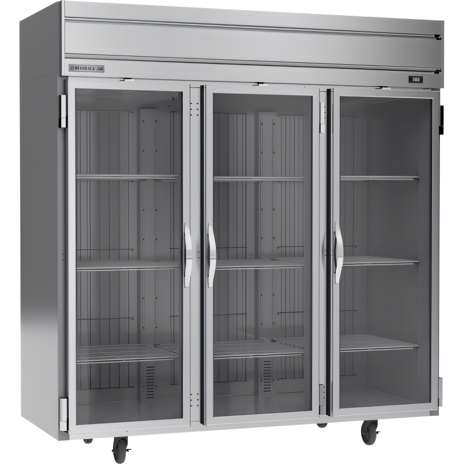 Horizon Series Freezer, reach-in, three-section, 78"W, 85" H, 69.1 cu. ft. capacity, (1) center glass door right-hand hinged, (1) right glass door right-hand hinged, (1) left glass door left-hand hinged, door locks, (9) adjustable shelves, electronic control, LED interior lighting, digital display, expansion valve technology, automatic defrost, top-mounted self-contained refrigeration, R290 Hydrocarbon refrigerant, stainless steel front, gray painted sides, aluminum interior, (2) 3/4 HP, cULus, UL EPH Classifed, UL-Sanitation