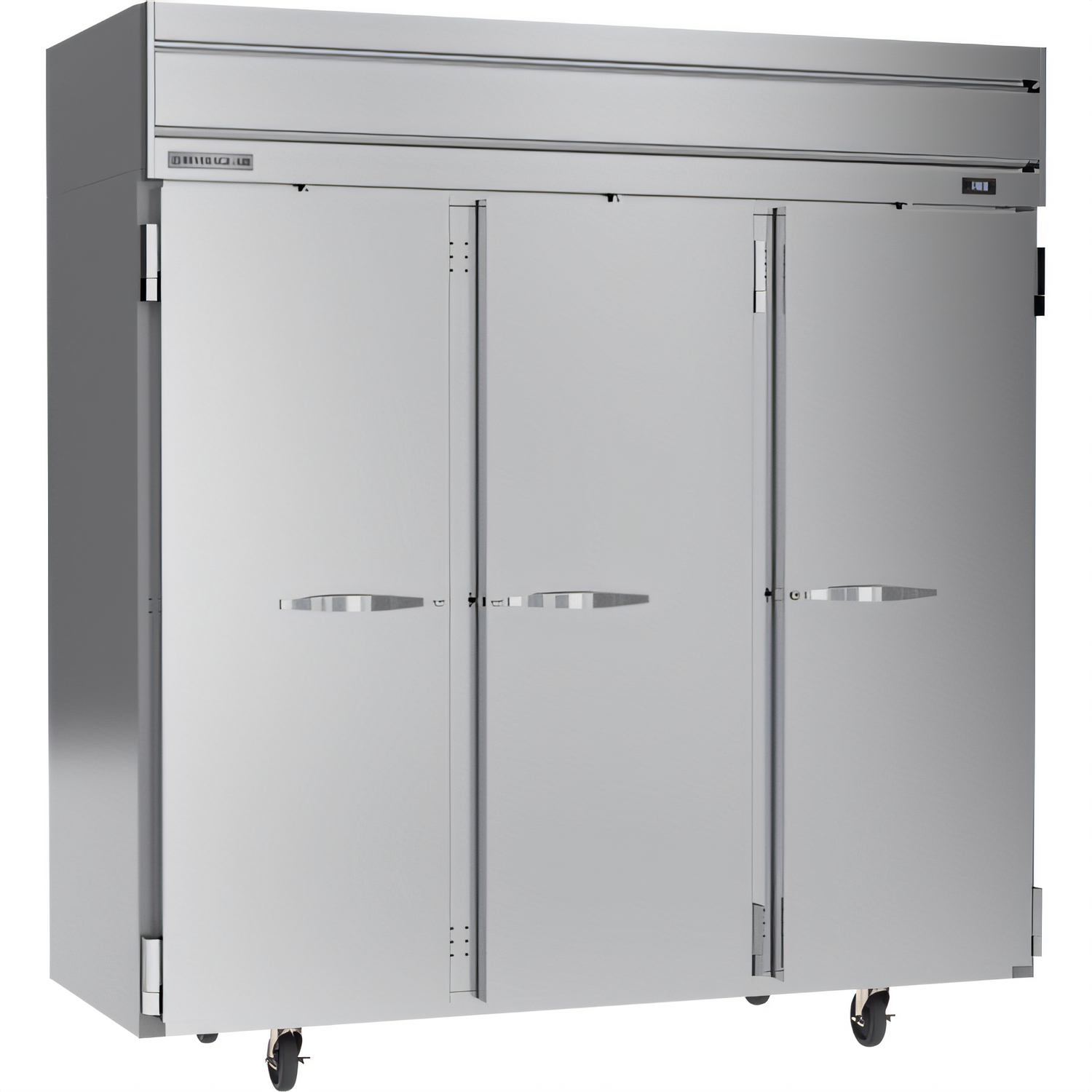 Horizon Series Freezer, reach-in, three-section, 78"W, 85" H, 69.1 cu. ft. capacity, (1) center solid door right-hand hinged, (1) right solid door right-hand hinged, (1) left solid door left-hand hinged, door locks, (9) adjustable shelves, electronic control, LED interior lighting, digital display, expansion valve technology, automatic defrost, top-mounted self-contained refrigeration, R290 Hydrocarbon refrigerant, stainless steel front, gray painted sides, aluminum interior, (2) 3/4 HP, cULus, UL EPH Classifed, UL-Sanitation
