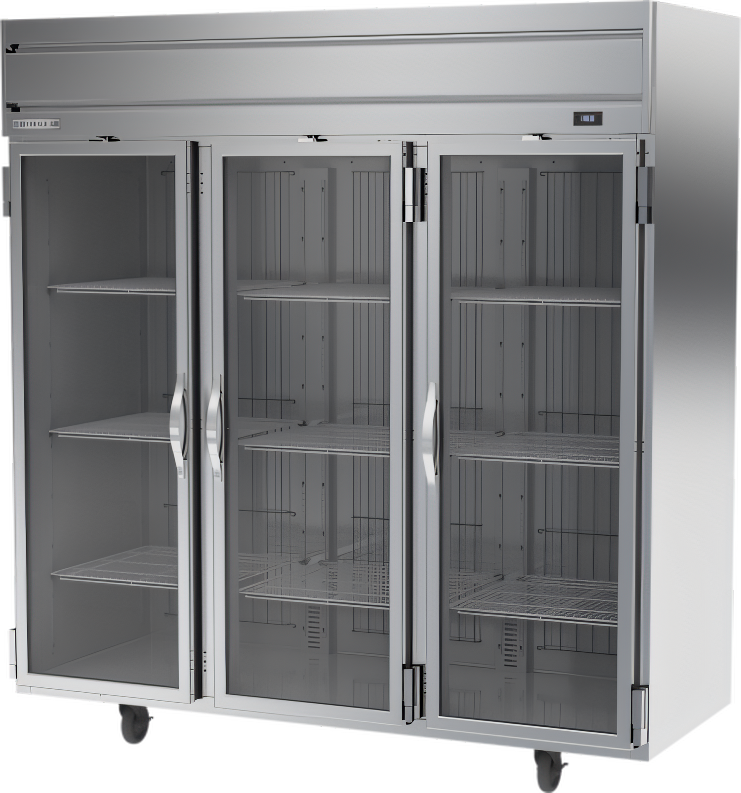 Horizon Series Freezer, reach-in, three-section, 69.1 cu. ft., (1) center glass door right-hand hinged, (1) right glass door right-hand hinged, (1) left glass door left-hand hinged, (9) adjustable shelves, electronic control, LED interior lighting, digital display, expansion valve technology, automatic defrost, top-mounted self-contained refrigeration, stainless steel front & sides, aluminum interior, (2) 3/4 HP, cULus, UL EPH Classified, UL-Sanitation