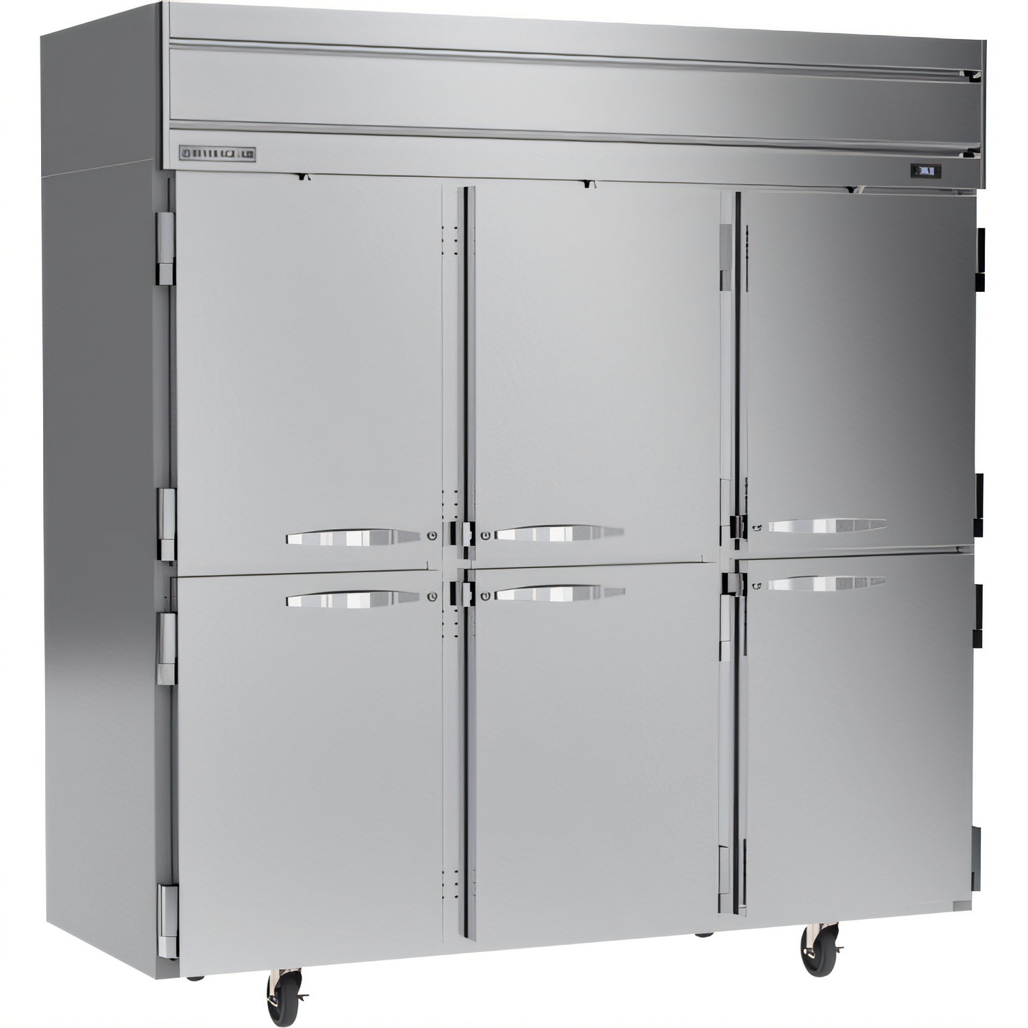 Horizon Series Refrigerator, reach-in, three-section, 78"W, 85"H, 71.52 cu. ft. capacity, (2) center half solid doors right-hand hinged, (2) right half solid doors right-hand hinged, (2) left half solid doors left-hand hinged, door locks, (9) shelves, electronic control, LED interior lighting, digital display, stainless steel front, gray painted sides, aluminum interior, top-mounted self-contained refrigeration, R290 Hydrocarbon refrigerant, Variable Speed Technology, 1/3 HP, cULus, UL EPH Classified, UL-Sanitation