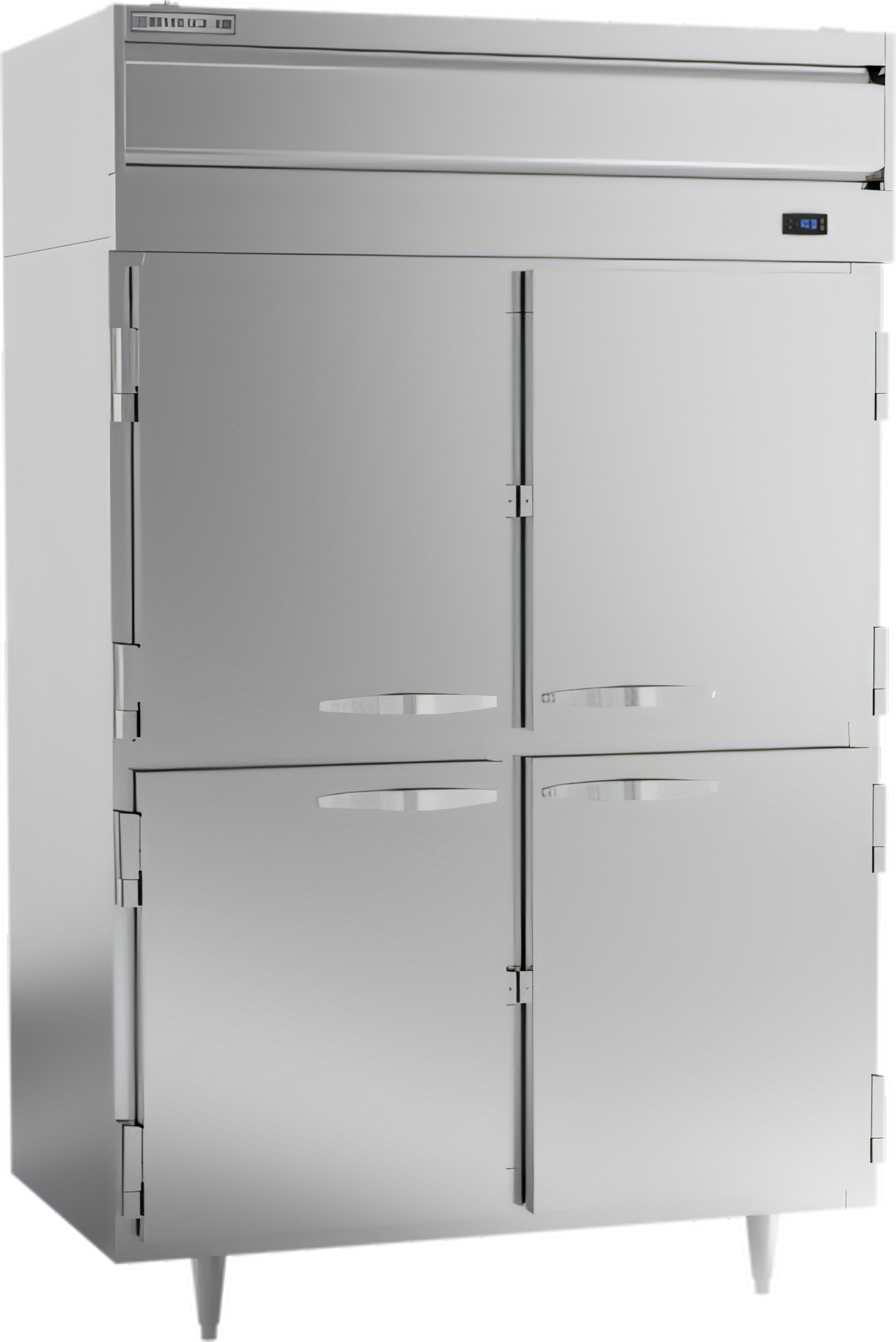 Freezer, reach-in, two-section, 44.57 cu. ft., (4) solid half doors (lockable), (6) adjustable shelves, exterior digital thermometer, interior LED lighting, top-mounted self-contained refrigeration, aluminum interior, exterior stainless steel front & sides (galvanized top, bottom & back), 3/4 HP, cULus, UL EPH Classified, UL-Sanitation