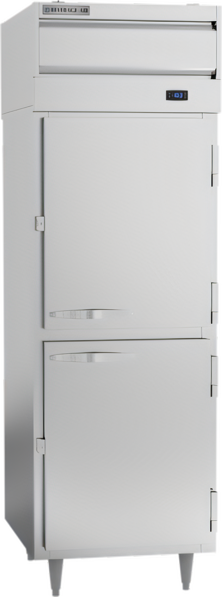 Freezer, Pass-Thru, one-section, 22.9 cu. ft., top-mounted self-contained refrigeration, (4) solid half doors, (3) adjustable shelves, interior LED lighting, aluminum interior, stainless steel exterior, standard depth cabinet, half-height doors, exterior digital thermometer, 6" legs, 3/4 HP, cULus, UL EPH Classified, UL-Sanitation