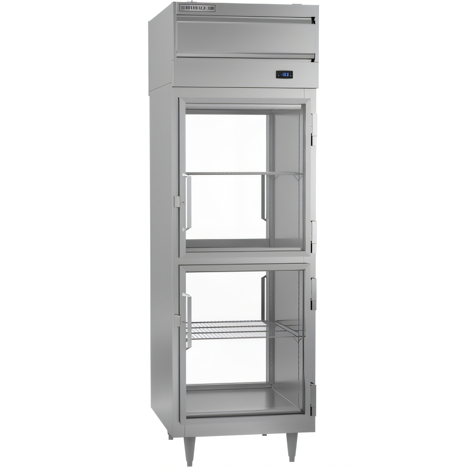 Freezer, Pass-Thru, one-section, 22.9 cu. ft., top-mounted self-contained refrigeration, (4) glass half doors, (3) adjustable shelves, interior LED lighting, aluminum interior, stainless steel exterior, standard depth cabinet, half-height doors, exterior digital thermometer, 6" legs, 3/4 HP, cULus, UL EPH Classified, UL-Sanitation