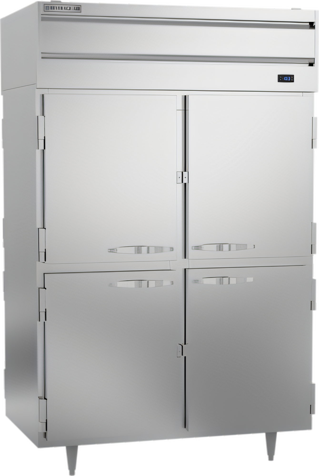 Freezer, Pass-Thru, two-section, 48.33 cu. ft., top-mounted self-contained refrigeration, (8) solid half doors, (6) adjustable shelves, interior LED lighting, aluminum interior, stainless steel exterior, standard depth cabinet, half-height doors, exterior digital thermometer, 6" legs, (2) 3/4 HP, cULus, UL EPH Classified, UL-Sanitation