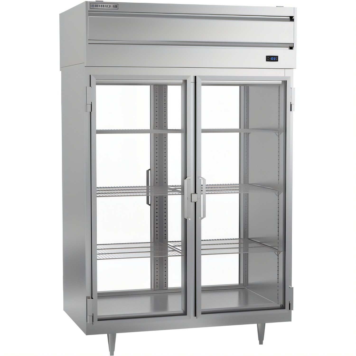 Freezer, Pass-Thru, two-section, 48.33 cu. ft., top-mounted self-contained refrigeration, (4) glass full height doors, (6) adjustable shelves, interior LED lighting, aluminum interior, stainless steel exterior, standard depth cabinet, half-height doors, exterior digital thermometer, 6" legs, (2) 3/4 HP, cULus, UL EPH Classified, UL-Sanitation