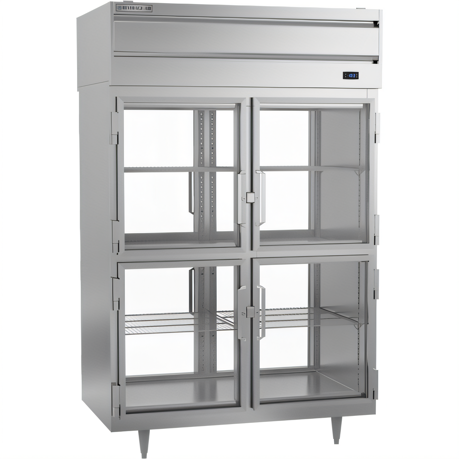 Freezer, Pass-Thru, two-section, 48.66 cu. ft., top-mounted self-contained refrigeration, (8) glass half doors, (6) adjustable shelves, interior LED lighting, aluminum interior, stainless steel exterior, standard depth cabinet, half-height doors, exterior digital thermometer, 6" legs, (2) 3/4 HP, cULus, UL EPH Classified, UL-Sanitation