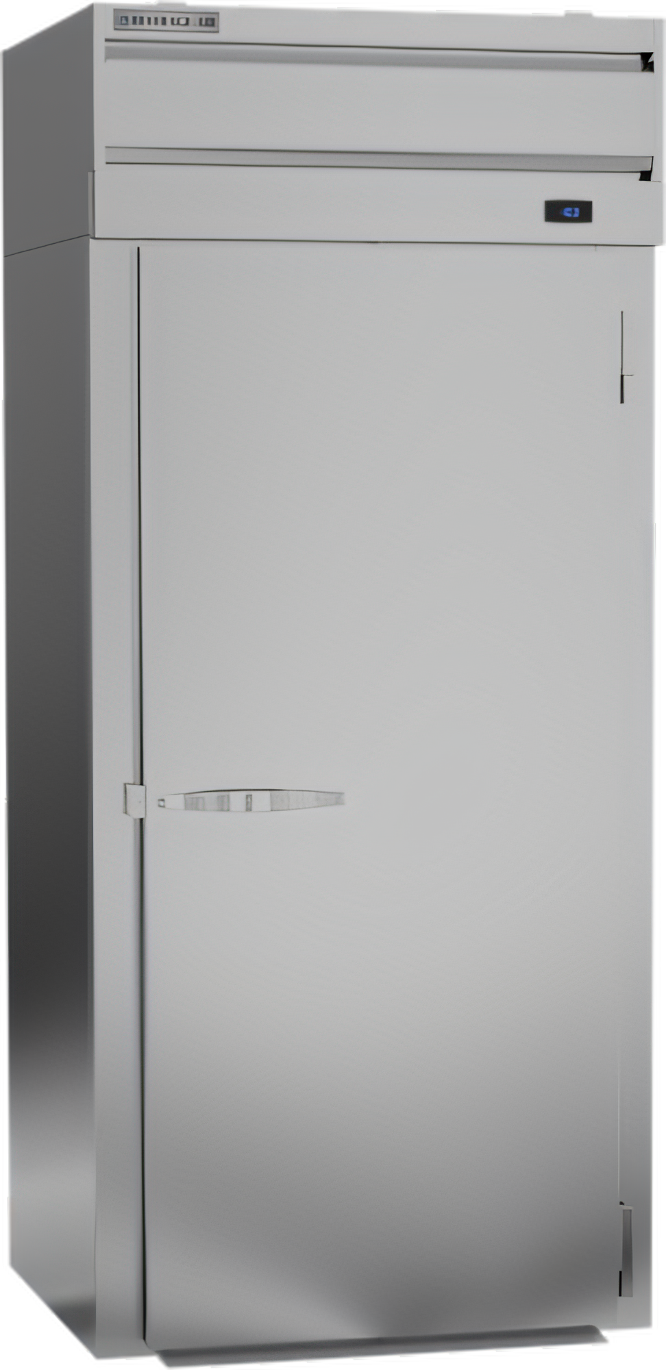 Freezer, roll-in, one-section, 34.86 cu. ft., (1) full-height locking door with bottom wiper gasket, accepts carts up to 24-3/8"W x 26"D x 64-1/2"H (cart not included), exterior digital thermometer, LED lighting, stainless steel breakers, automatic defrost, top-mounted self-contained refrigeration, stainless steel breakers, aluminum interior, stainless steel exterior, ramp, 3/4 HP, cULus, UL EPH Classified, UL-Sanitation