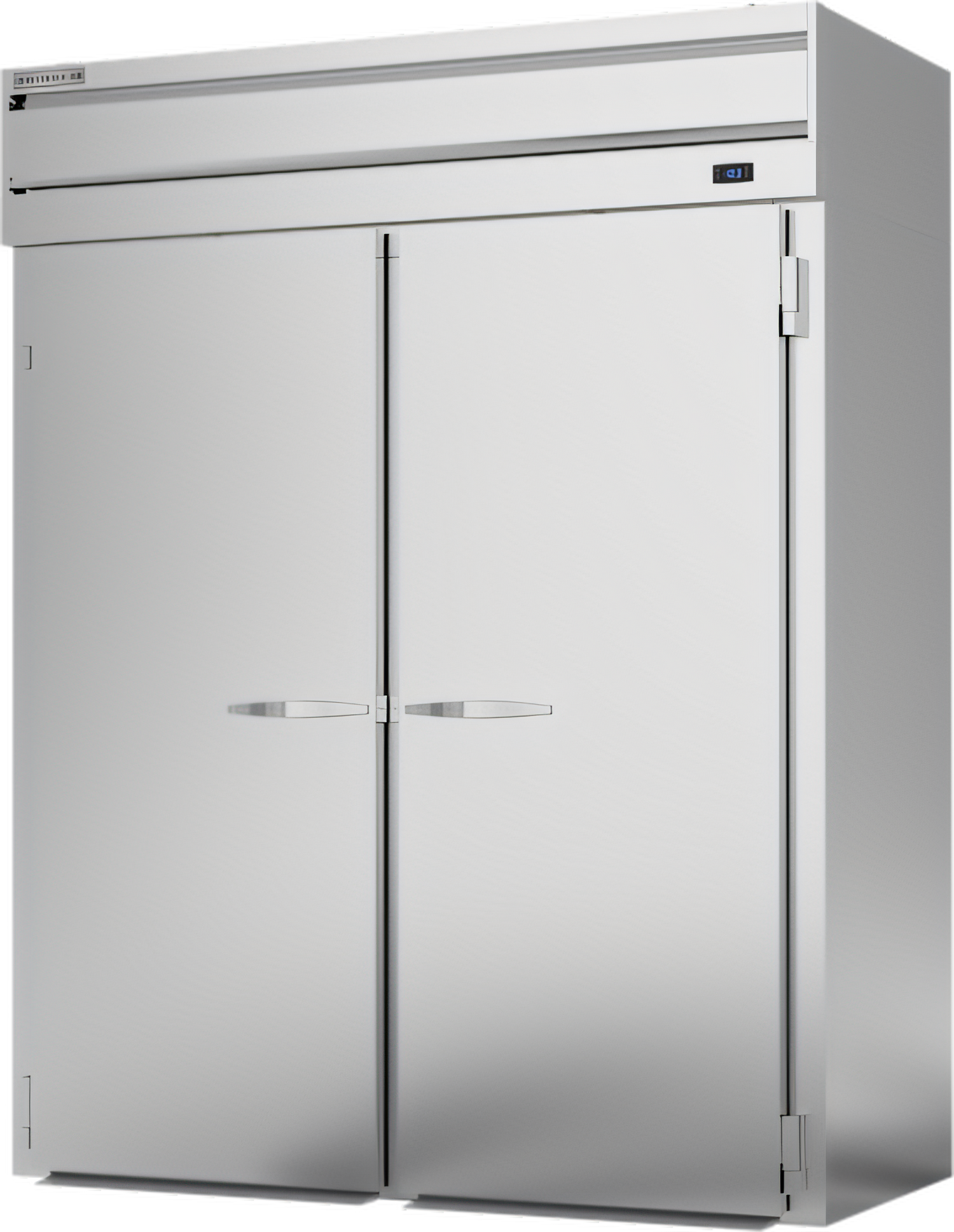 Freezer, Extra Tall, roll-in, two-section, 77.35 cu. ft., (2) full-height locking doors with bottom wiper gasket, accepts carts up to 68-7/8"W x 36-1/4"D x 89-7/8"H (cart not included), exterior digital thermometer, LED lighting, stainless steel breakers, automatic defrost, top-mounted self-contained refrigeration, stainless steel breakers, aluminum interior, stainless steel exterior, ramp, (2) 3/4 HP, cULus, UL EPH Classified, UL-Sanitation