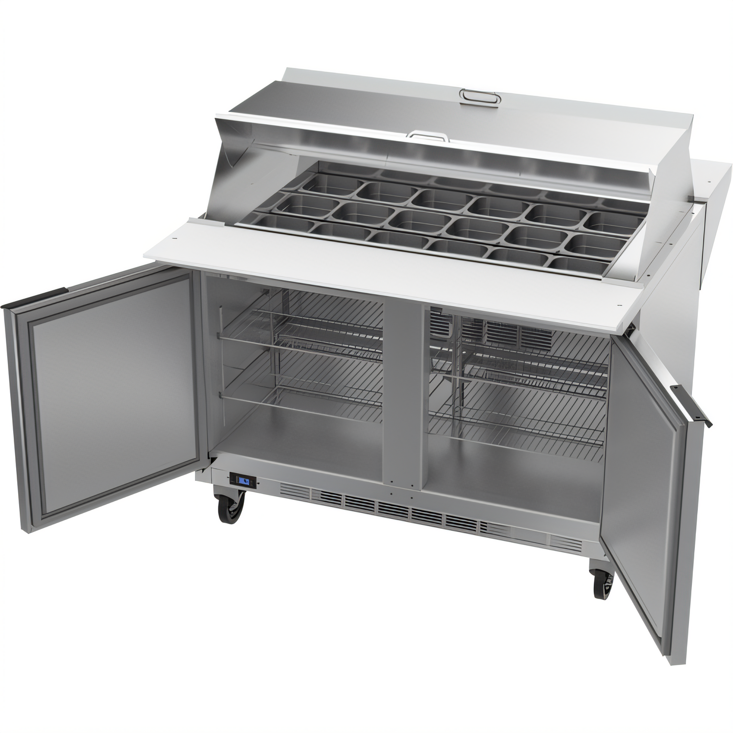 Dual Side Mega Top Refrigerated Counter, two-section, 48"W, 13.01 cu. ft., (2) doors, stainless steel top with opening for (18) 1/6 size pans, (1) 10" & (1) 12" cutting board, (4) shelves, stainless steel exterior, aluminum interior, rear-mounted self-contained refrigeration, (pans furnished are 4" deep, tops will accommodate 6" deep pans), R290 Hydrocarbon refrigerant, 1/6 HP, cULus, UL EPH Classified, UL-Sanitation